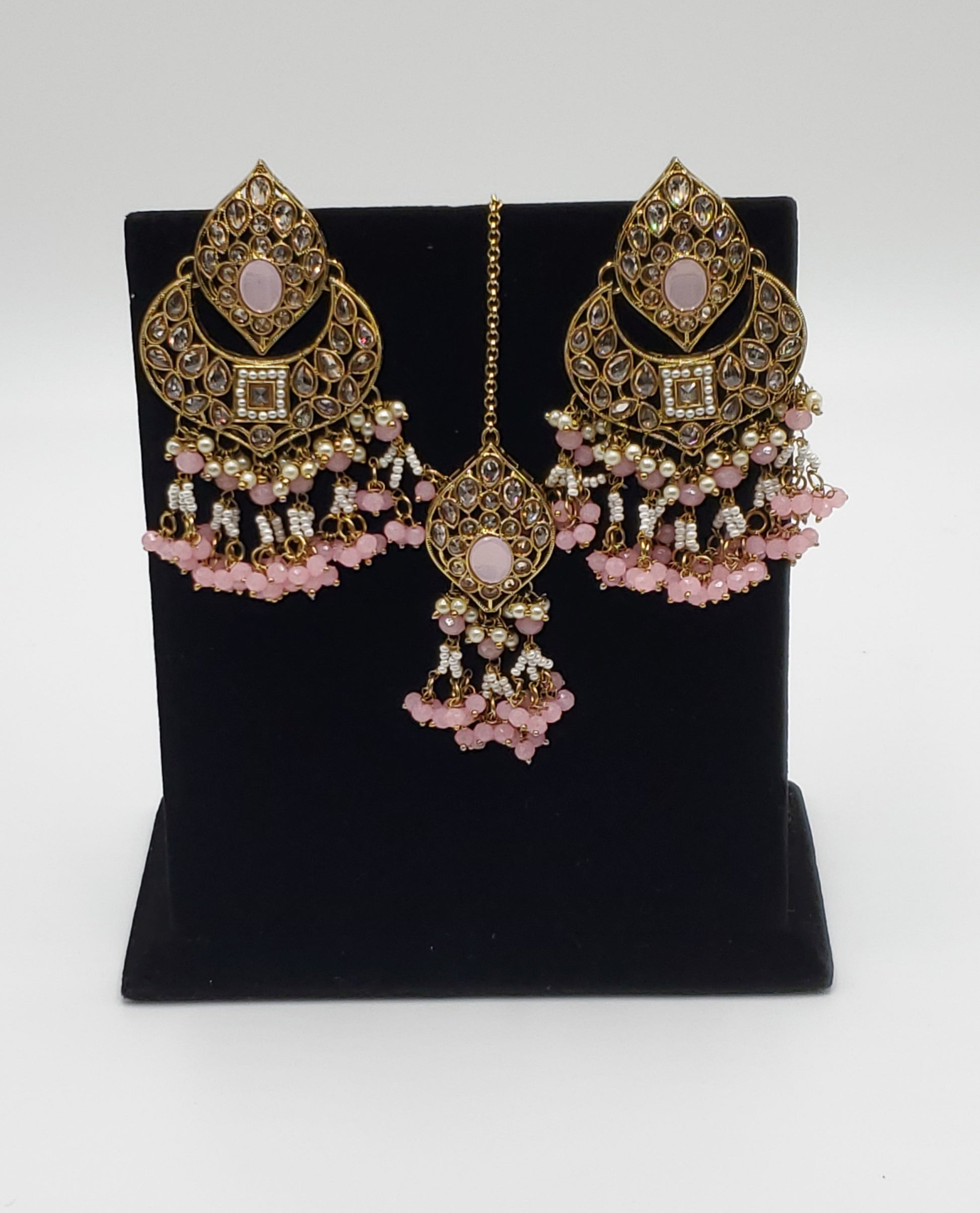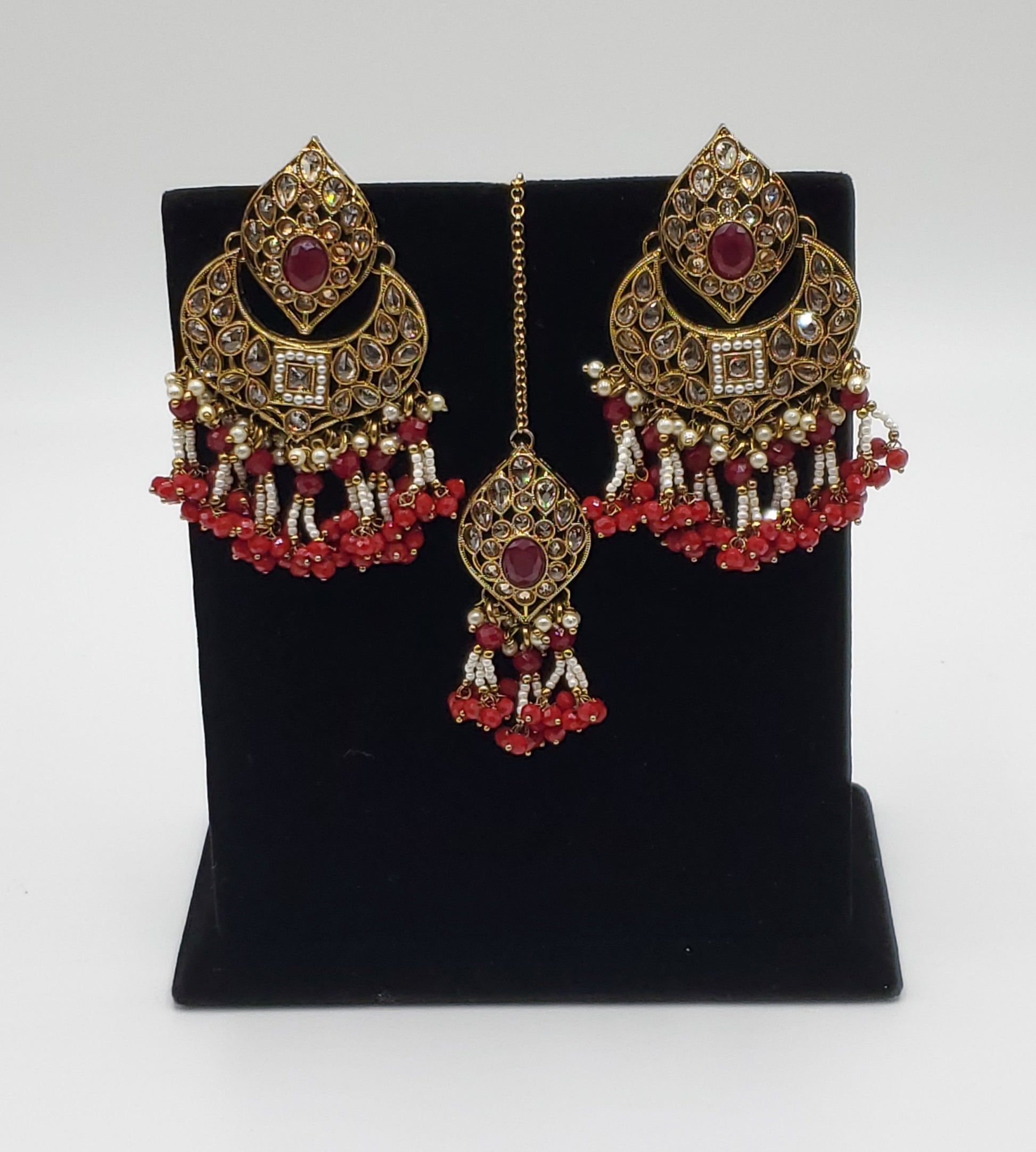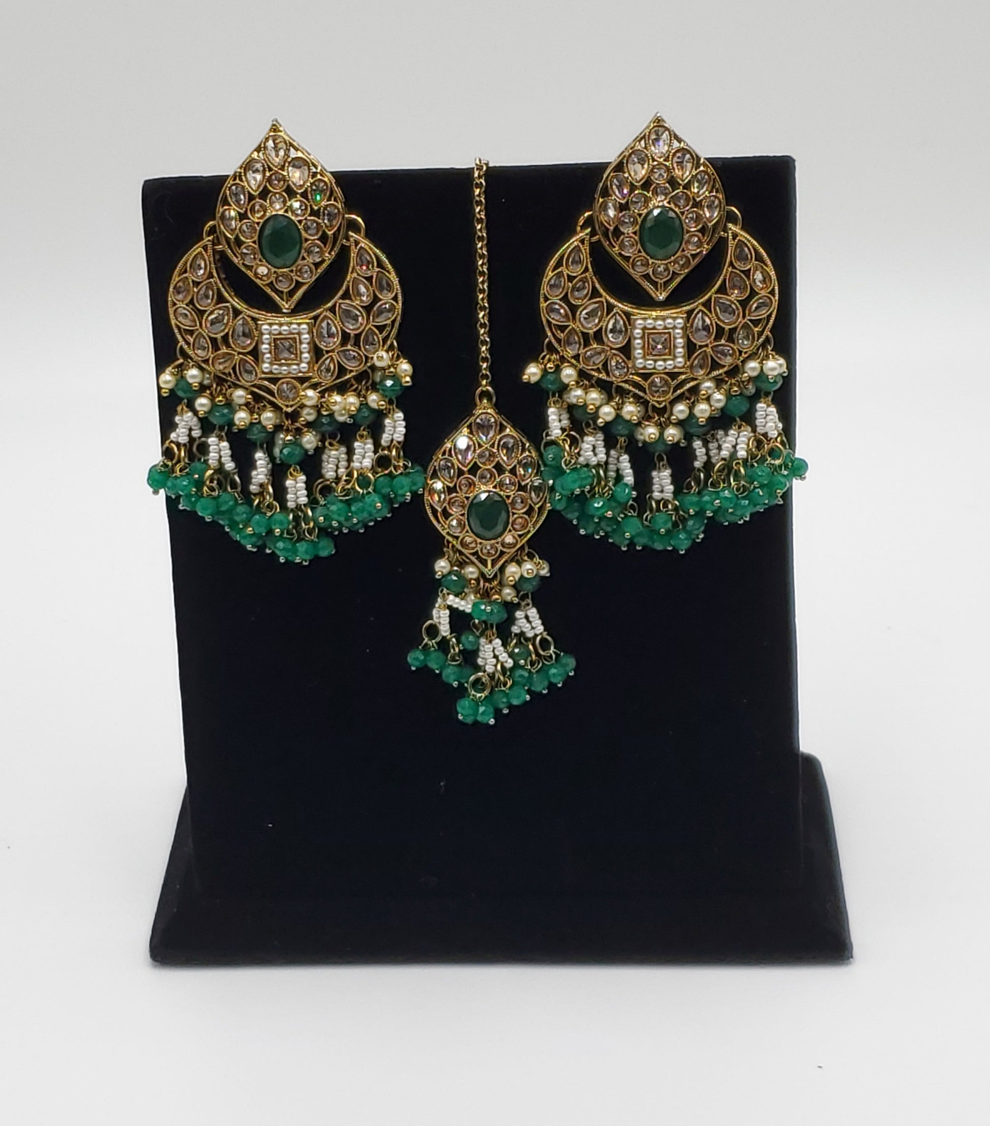 Gold Tone Earrings and Tikka With Simulated Polki Faux Pearl  Color Stones and Beeds