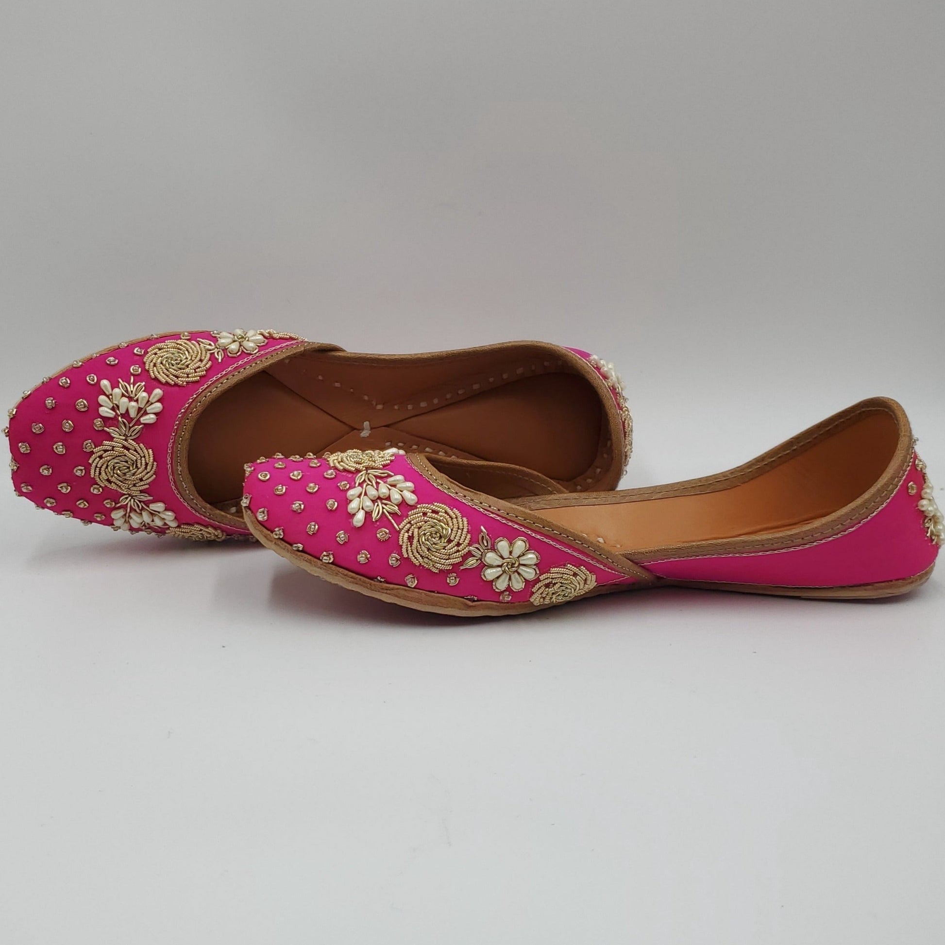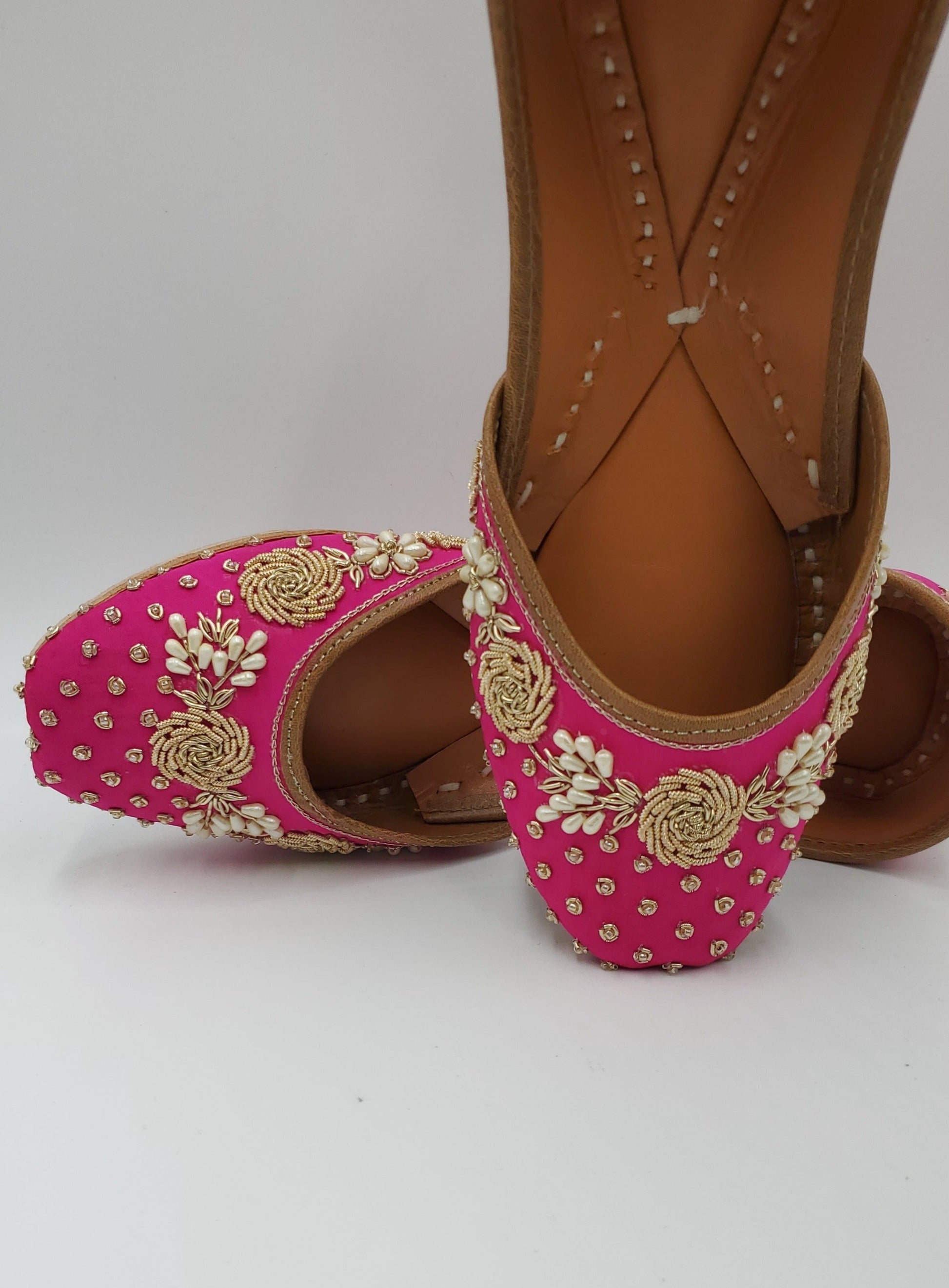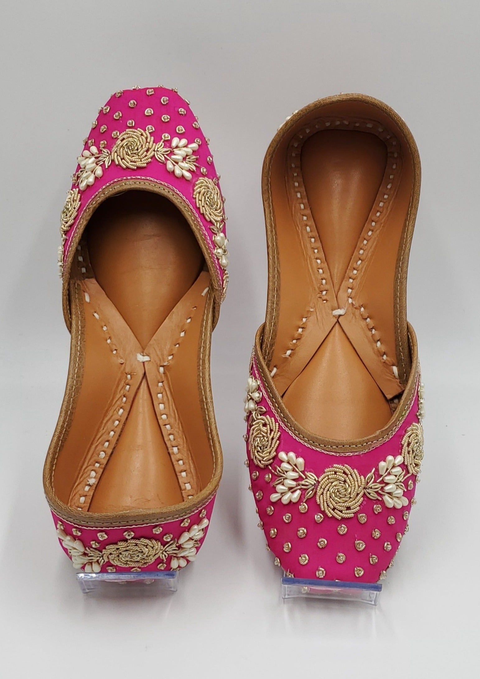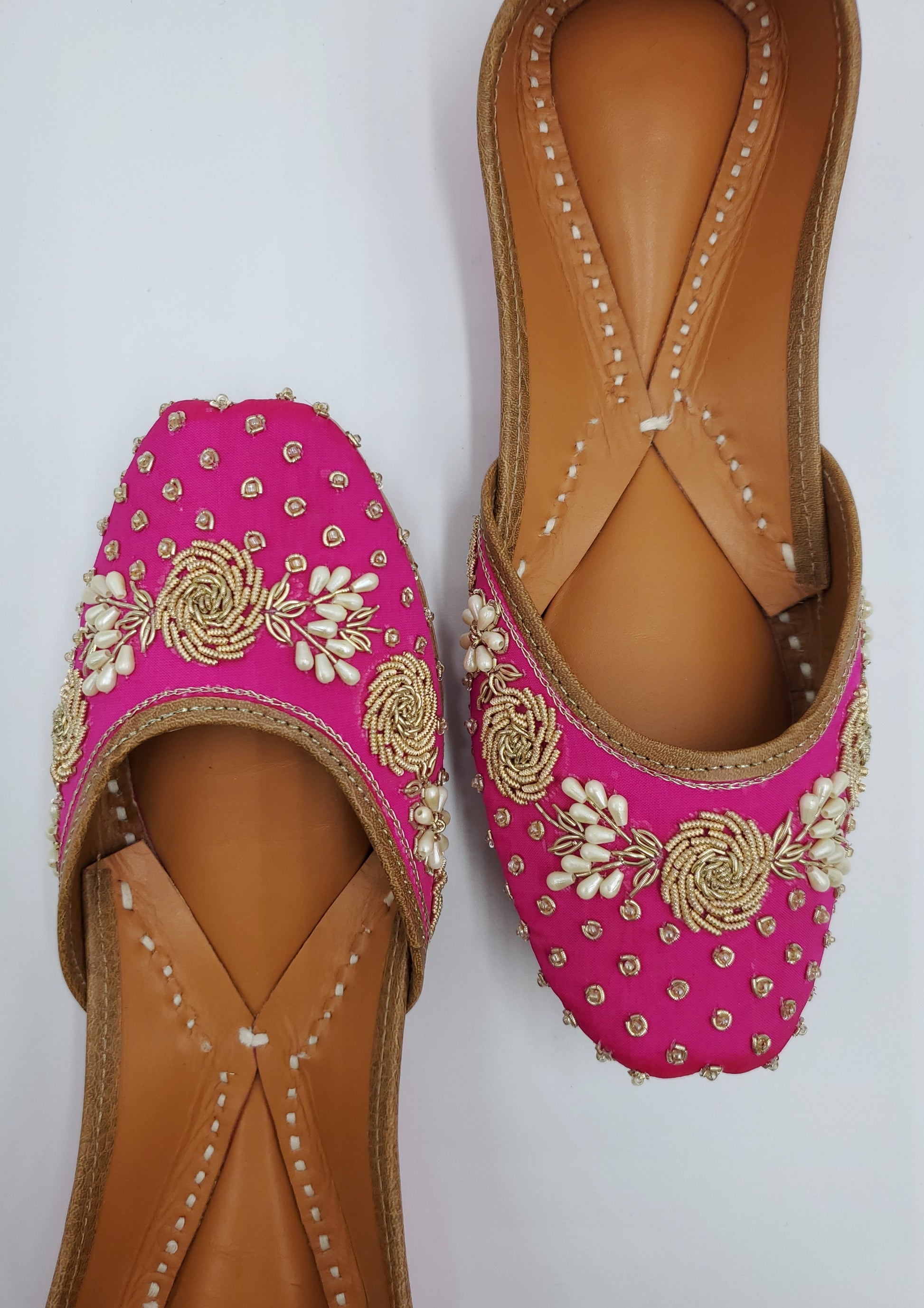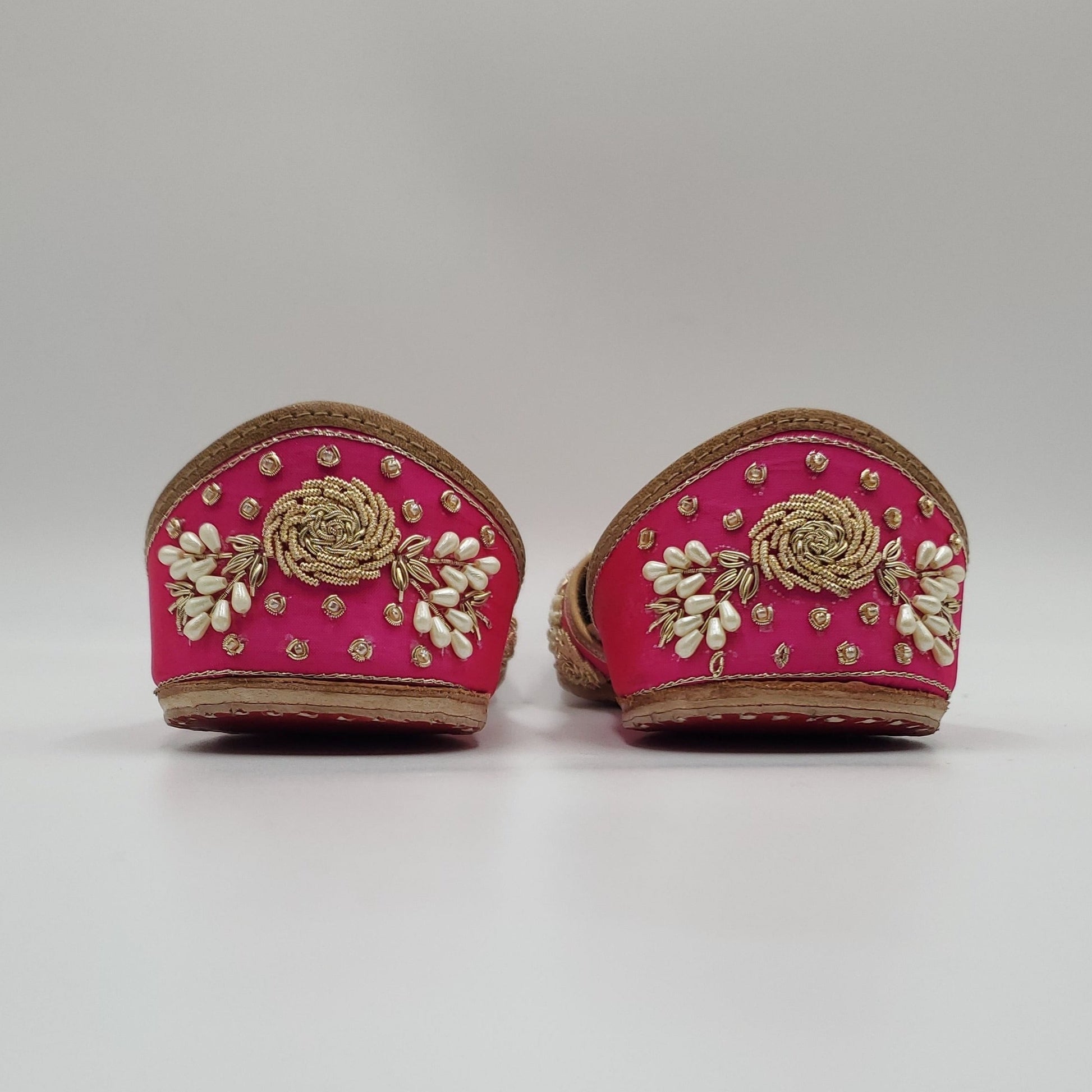 Bobo hot pink jutti beautifully handcrafted with white pearls and embellished with beads and thread work.  The interior is made of genuine leather and double cushioned making the jutti very comfortable to wear.