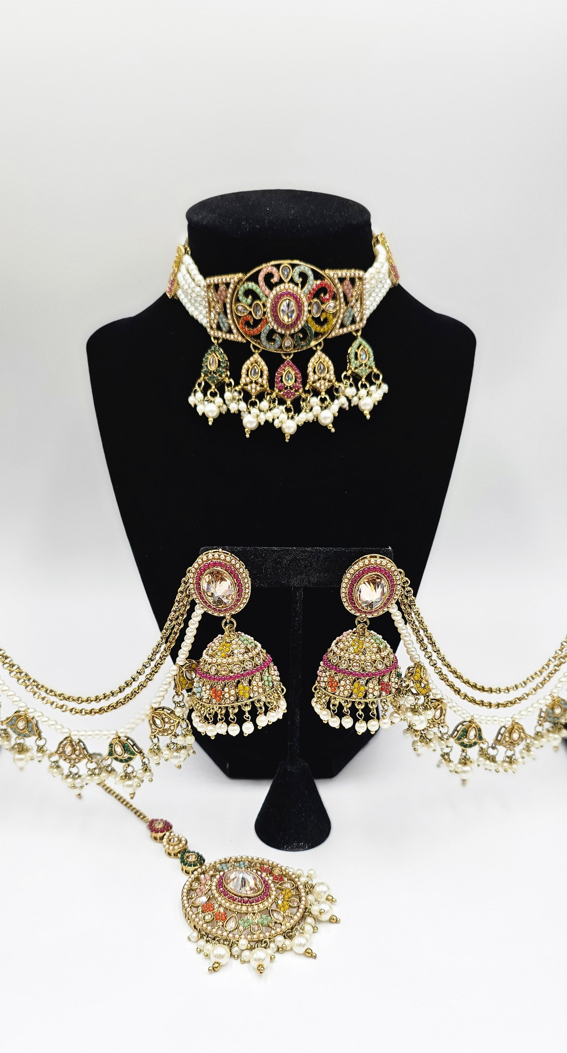 Multi choker set with bahuballi earrings. Good quality Jerkan set.