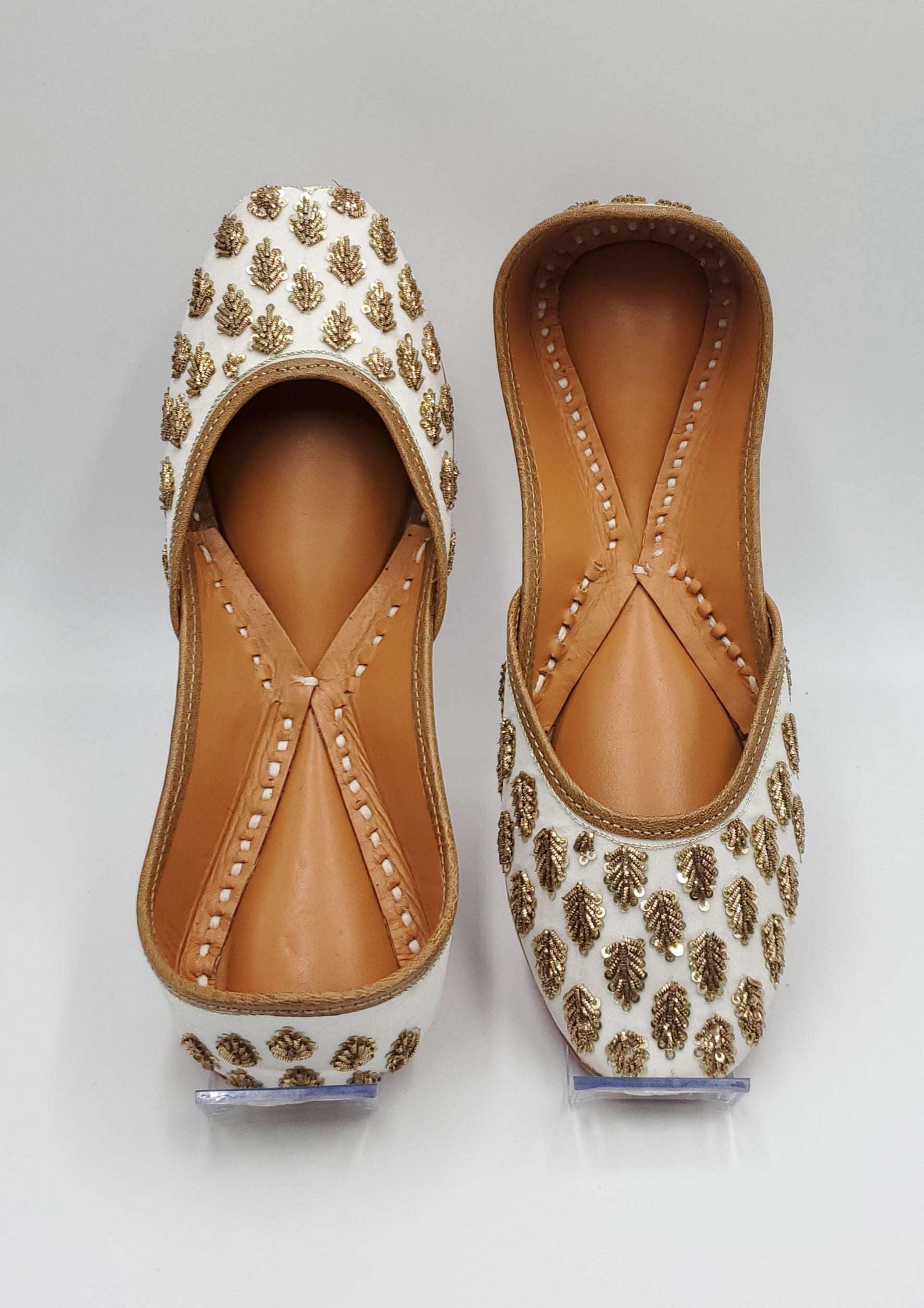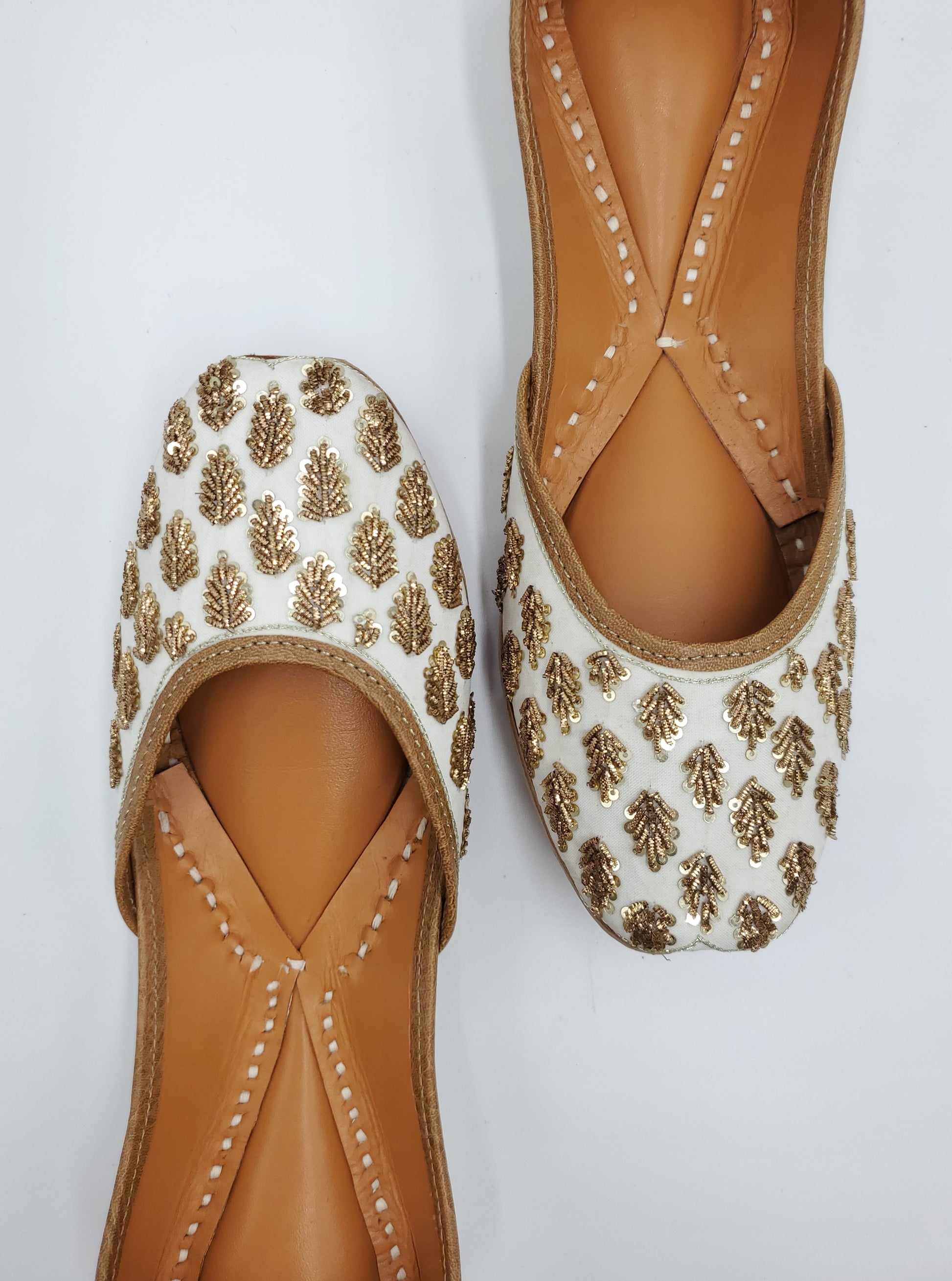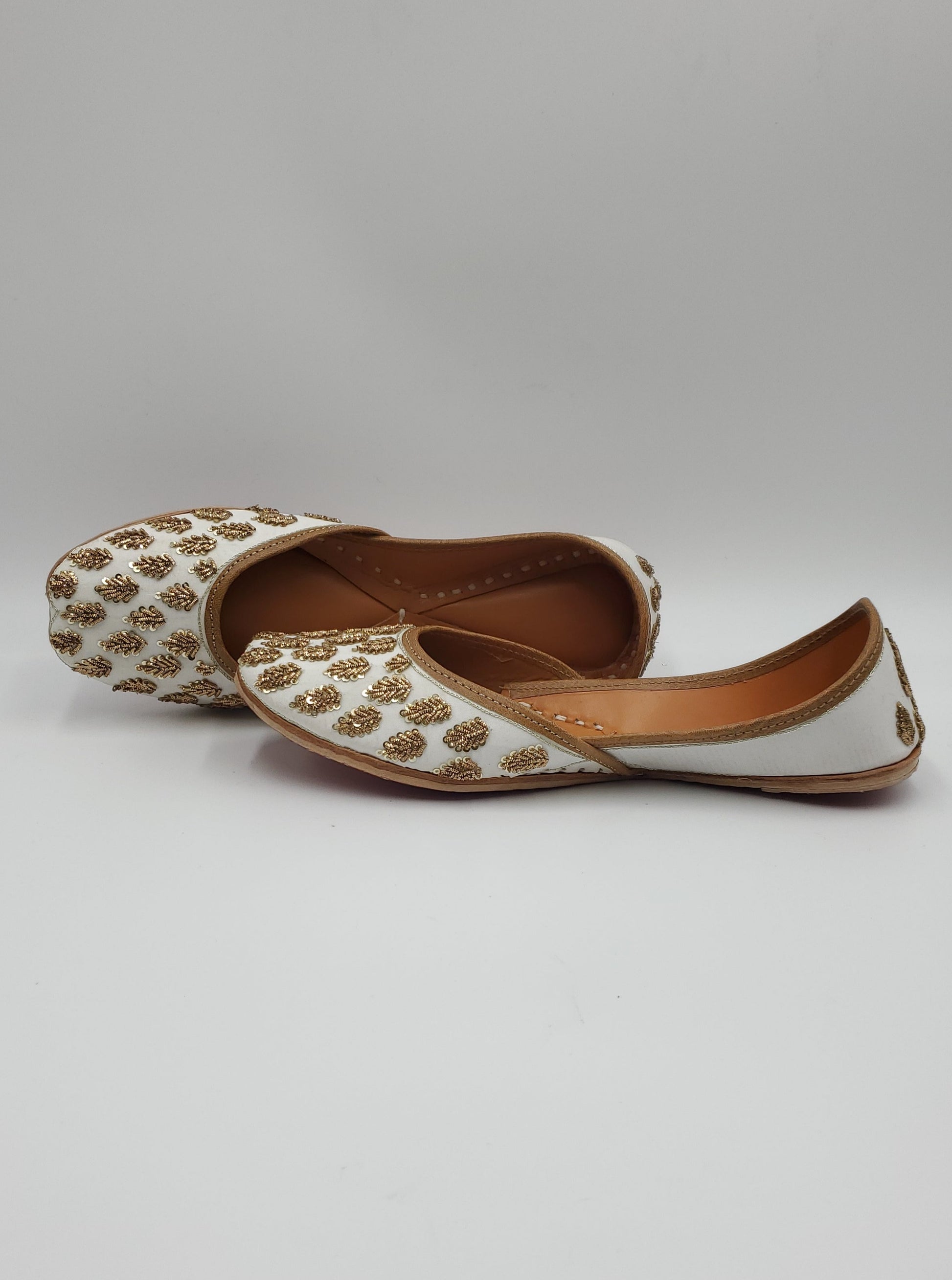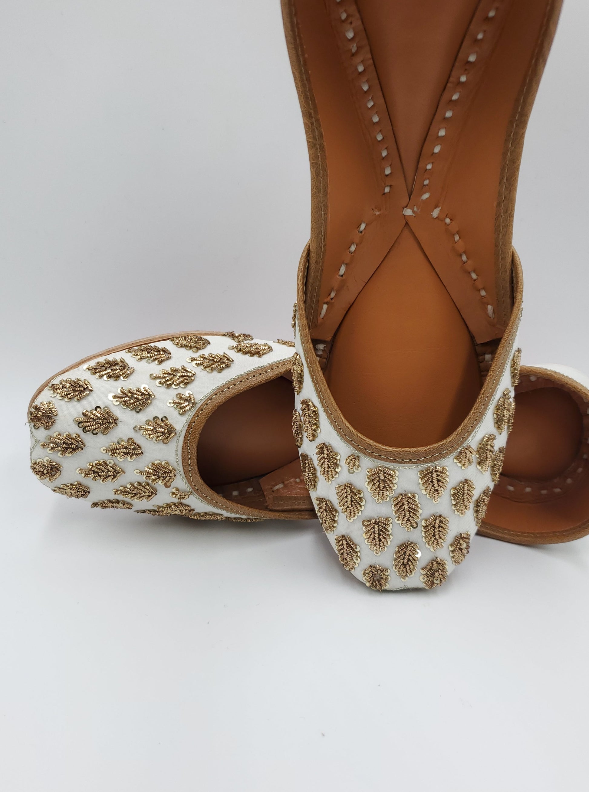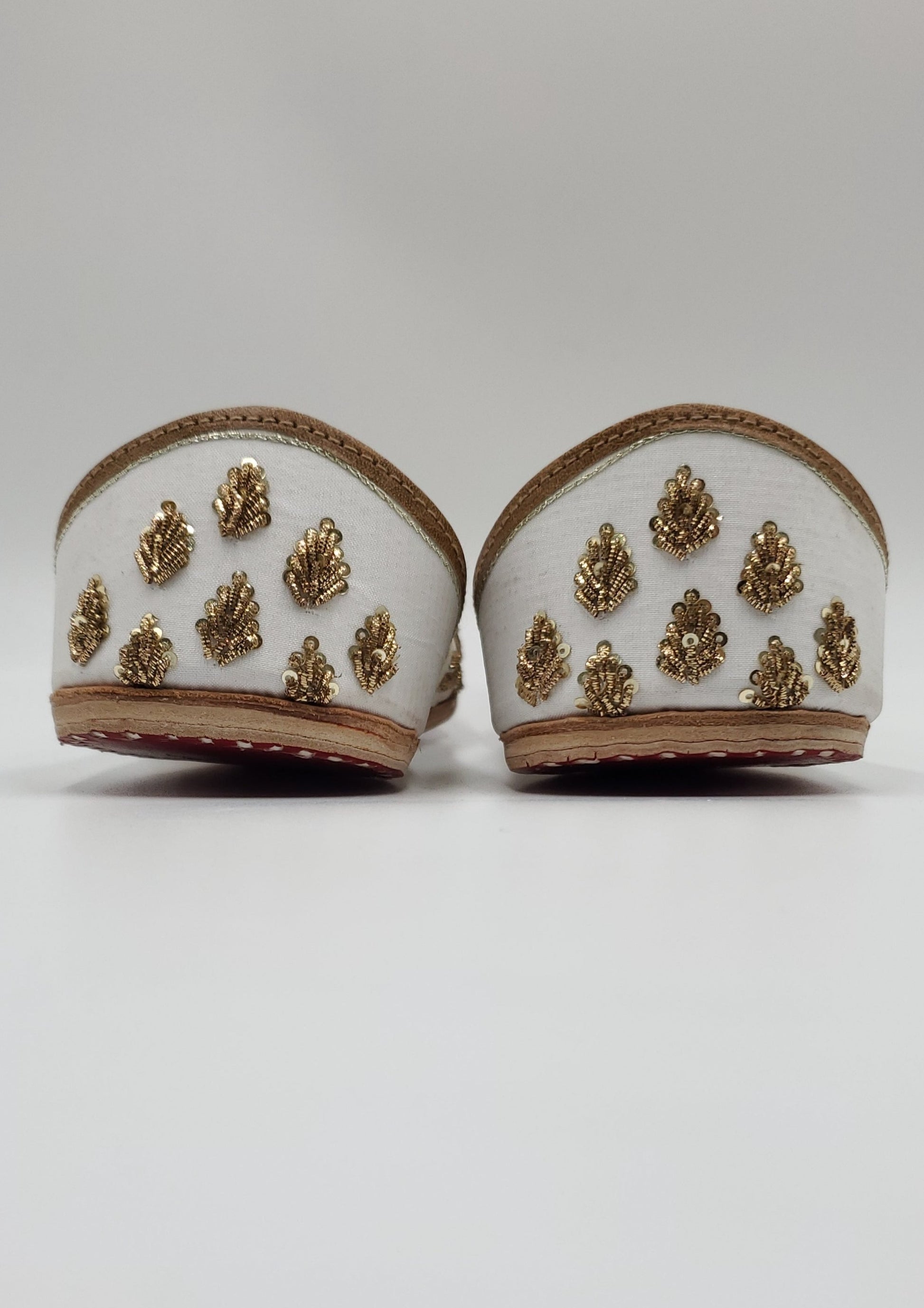 Juhi jutti beautifully handcrafted white and gold work embellished with thread work. The interior is made of genuine leather and double cushioned making the jutti very comfortable to wear.
