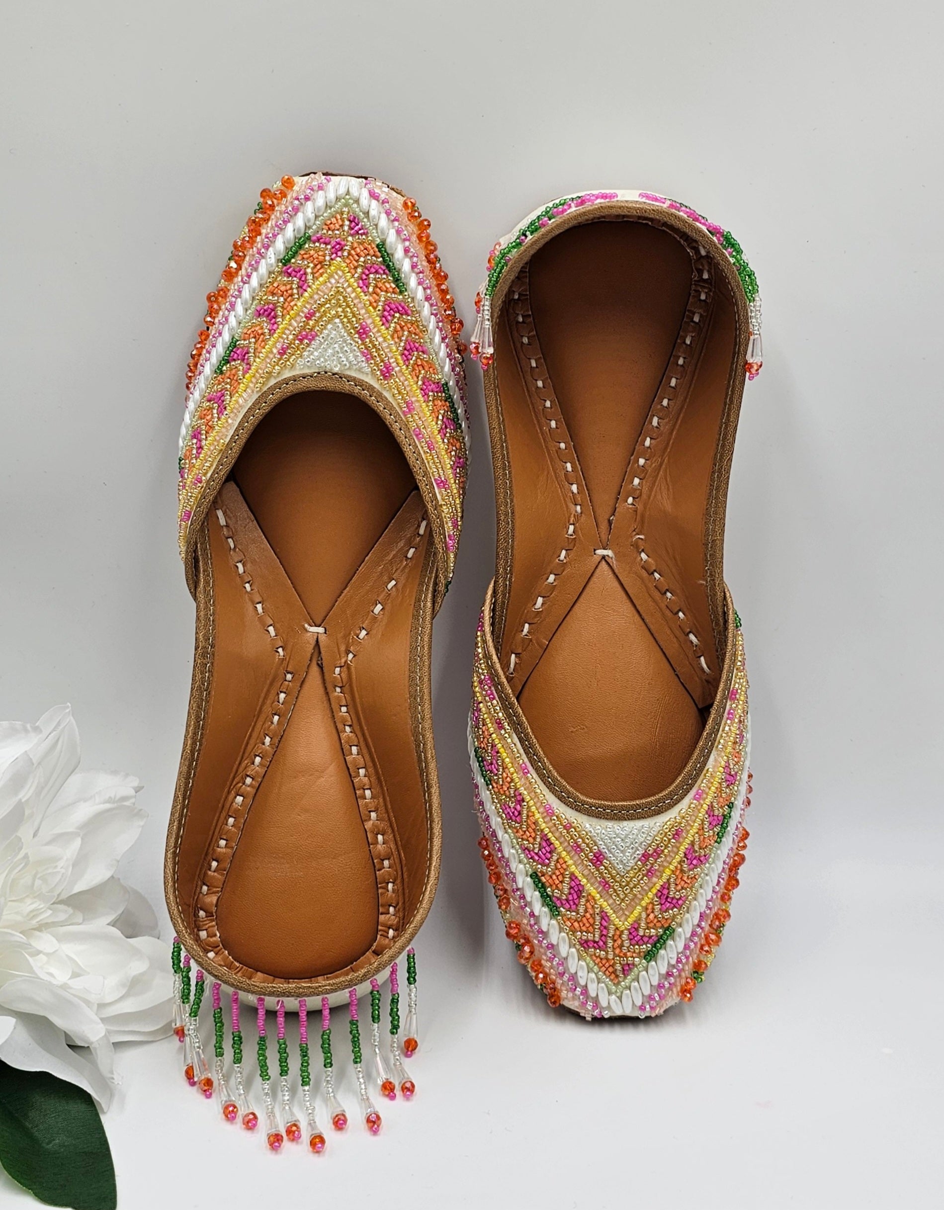 Kudrat Multi, this sparkling jutti will brighten up your day (or any outfit)! Beautifully handcrafted with pearls and embellished with various cuts. The interior is made of genuine leather and double cushioned making the jutti very comfortable to wear.