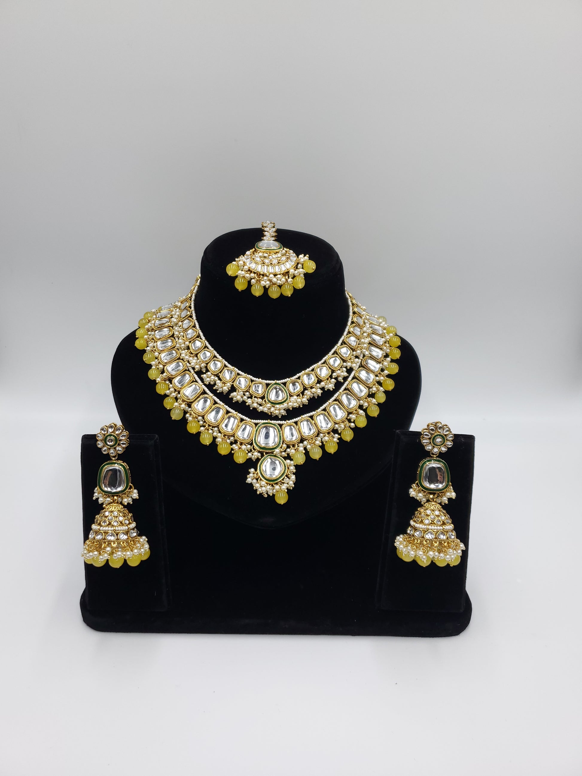 Gold Tone Necklace set studded with Simulated kundan and Faux Pearls.