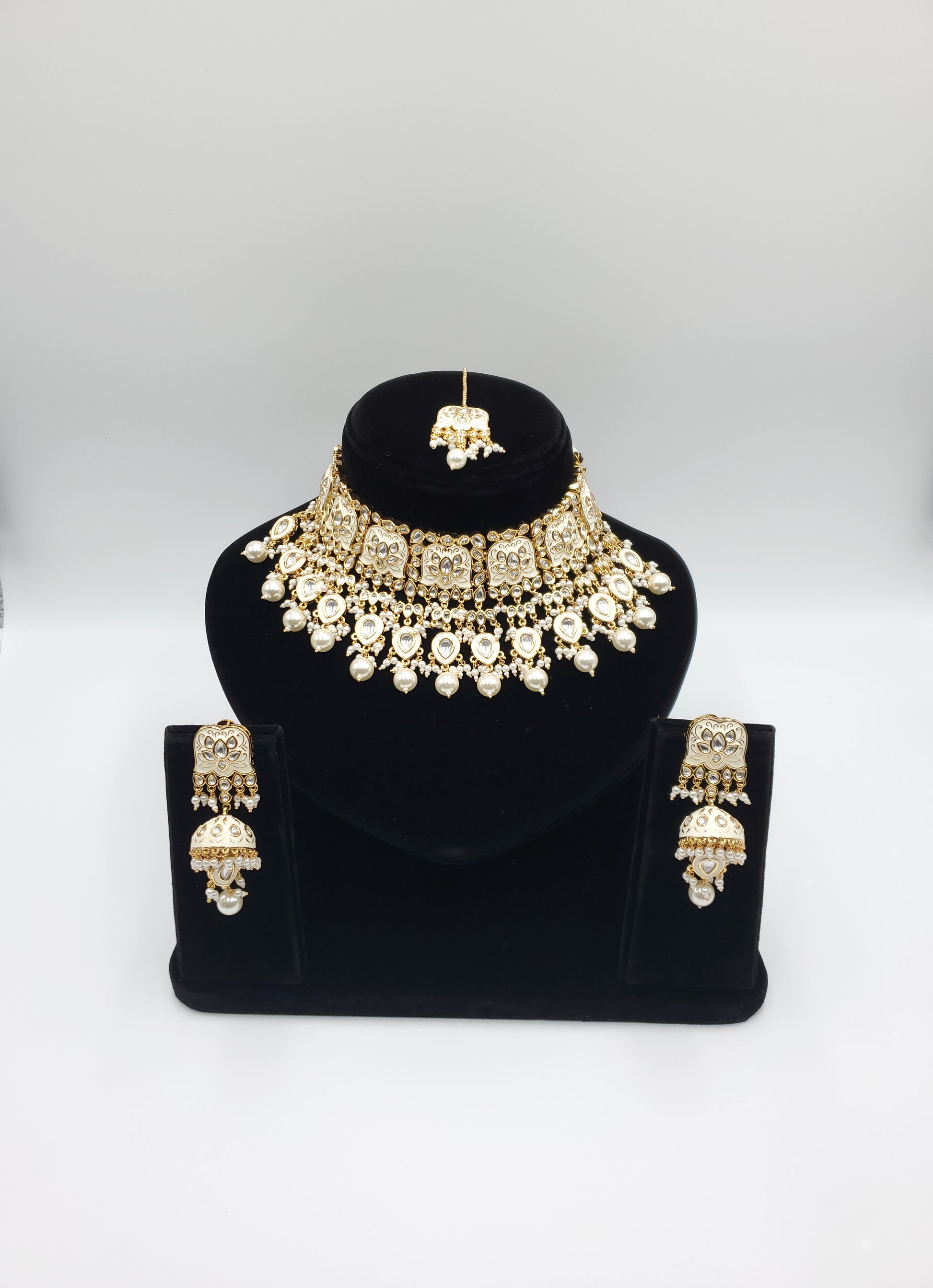 Gold Tone hand printed with kundan and Faux Pearls with earrings and Tikka.