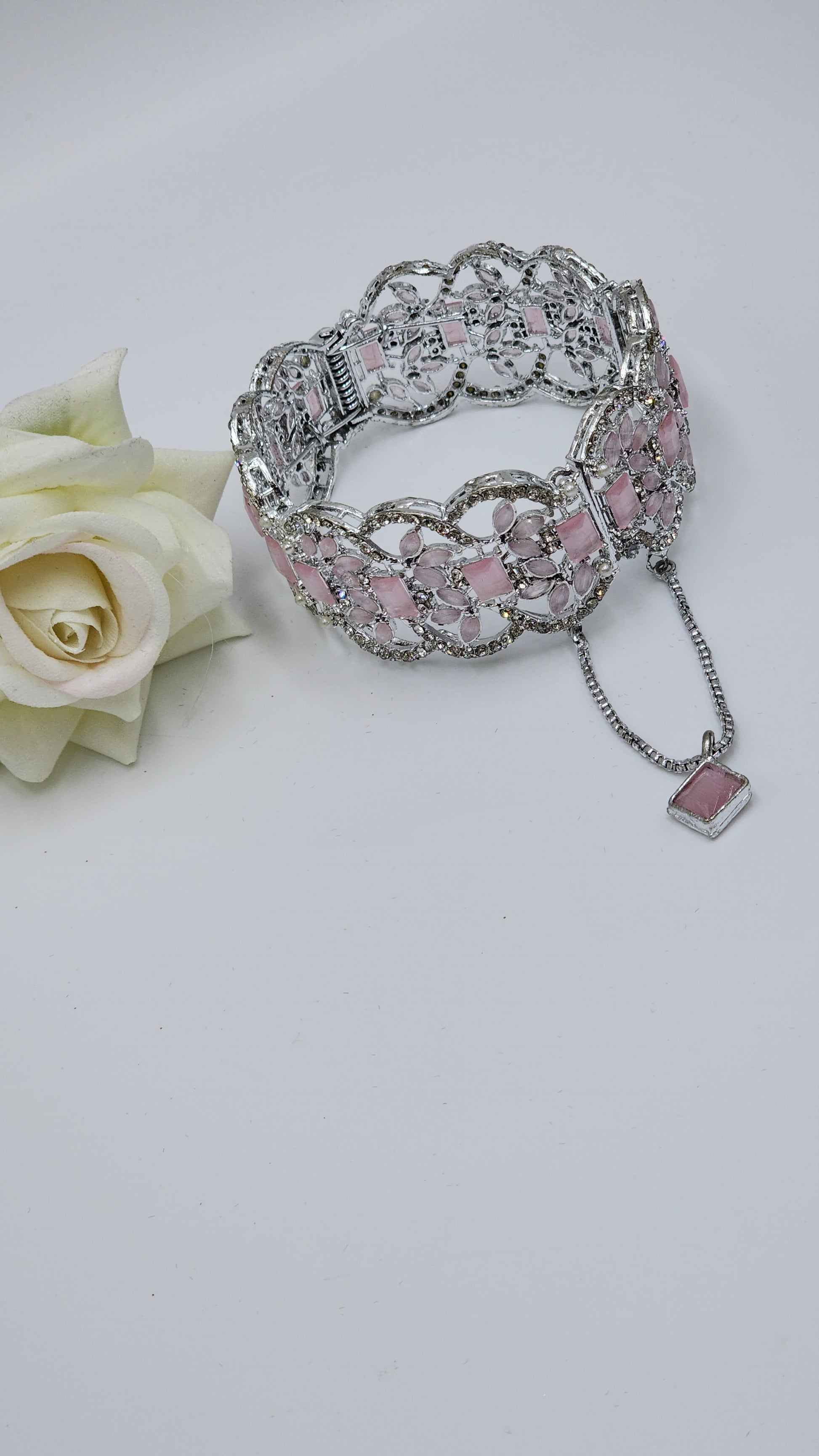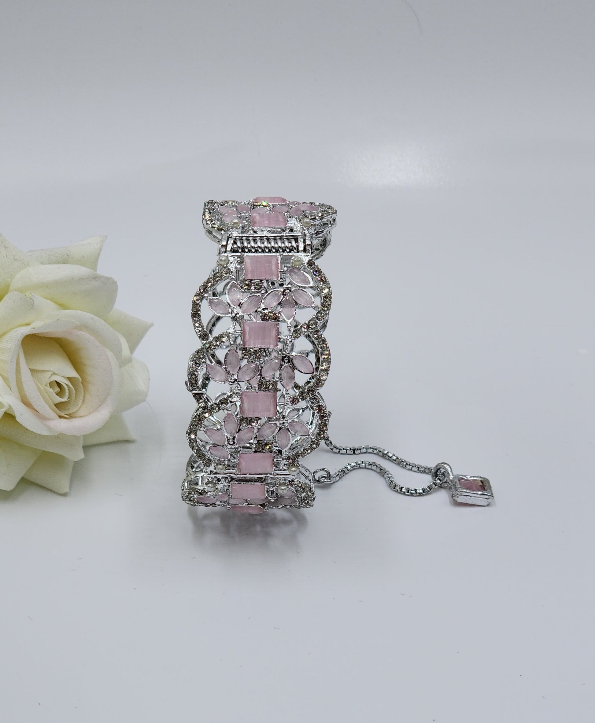 Silver bangles in AD with adjustable sizes.