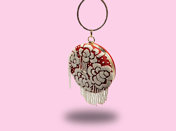 Add a touch of sophistication to your ensemble with our Round Clutch with Pearl Embellishments and Latkans. Designed to complement both traditional and modern attire, this clutch is the perfect accessory for weddings, parties, and elegant evenings out. Enhance your style and make a statement with this beautiful, eye-catching piece.