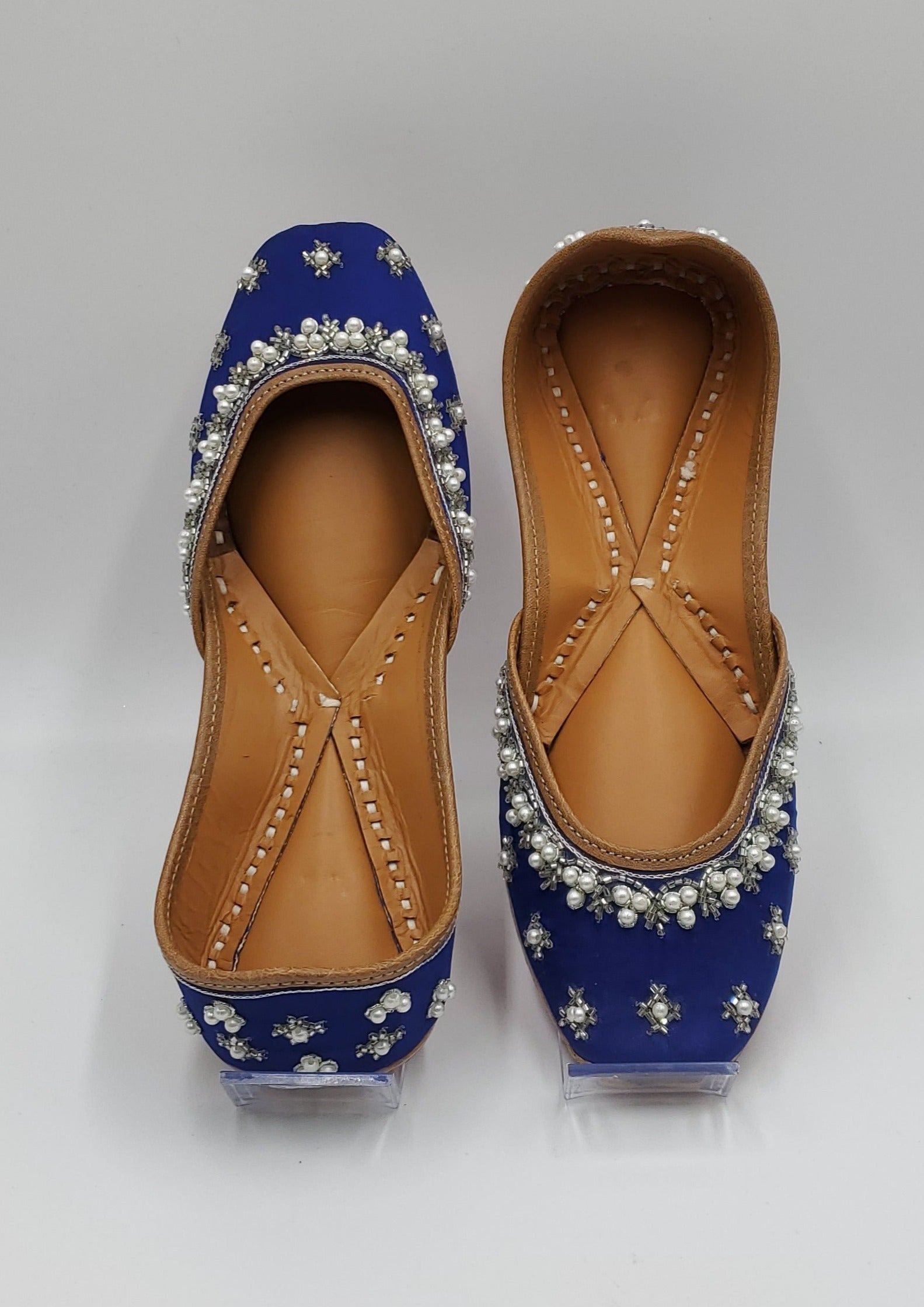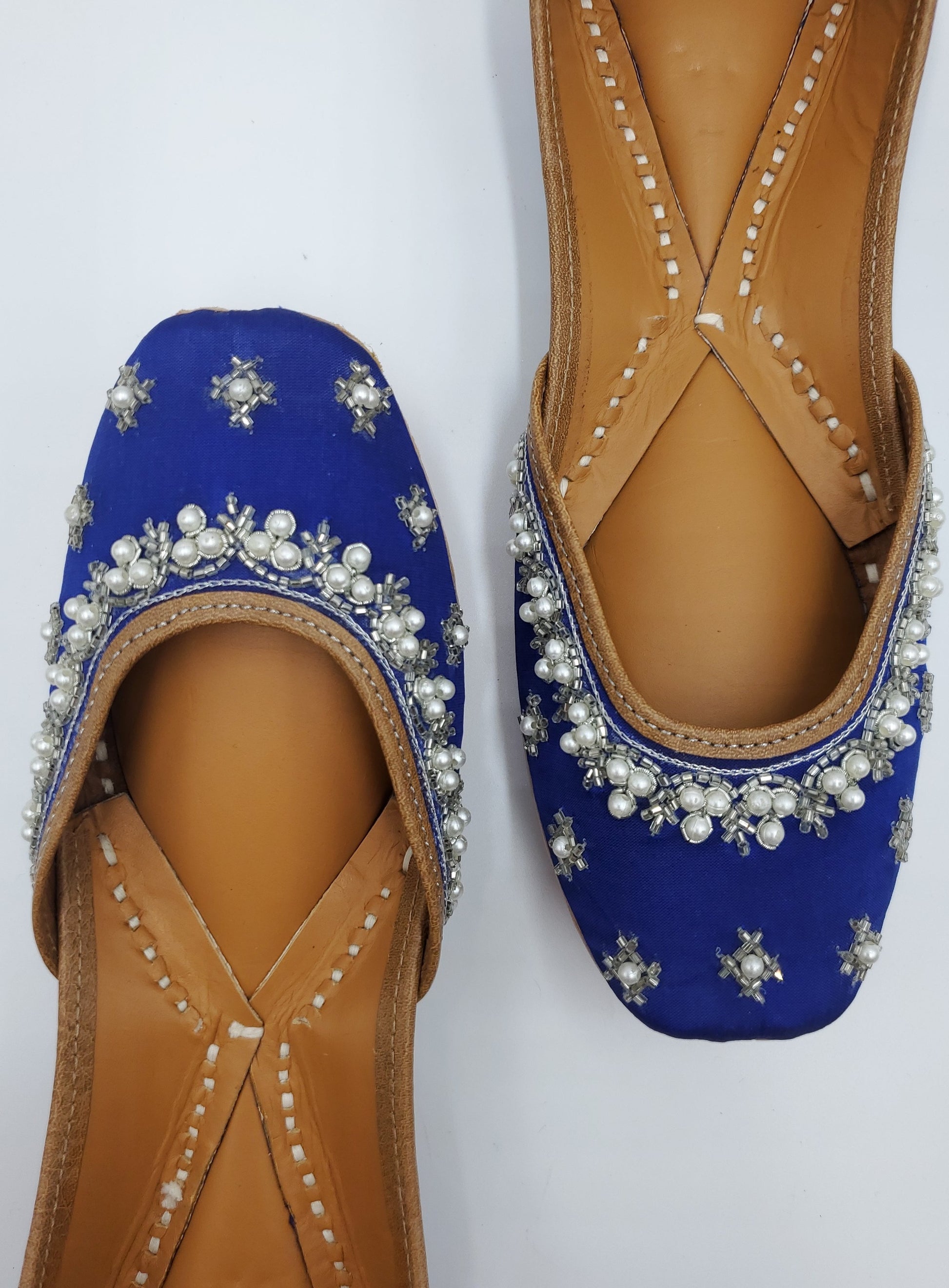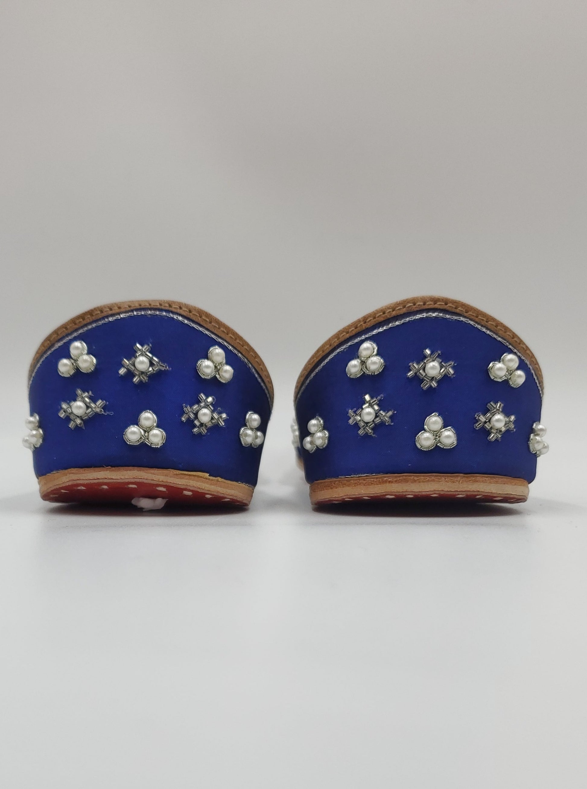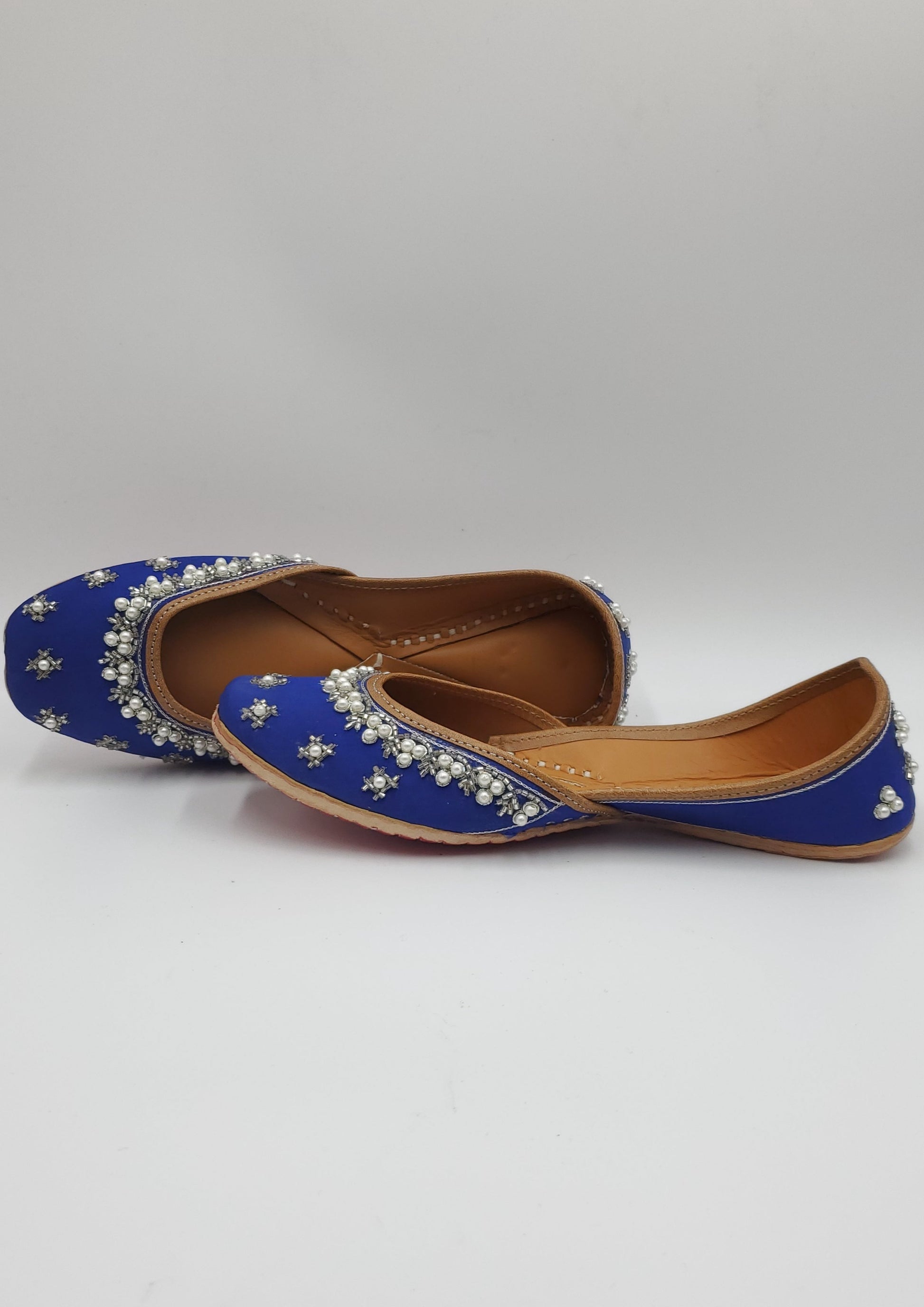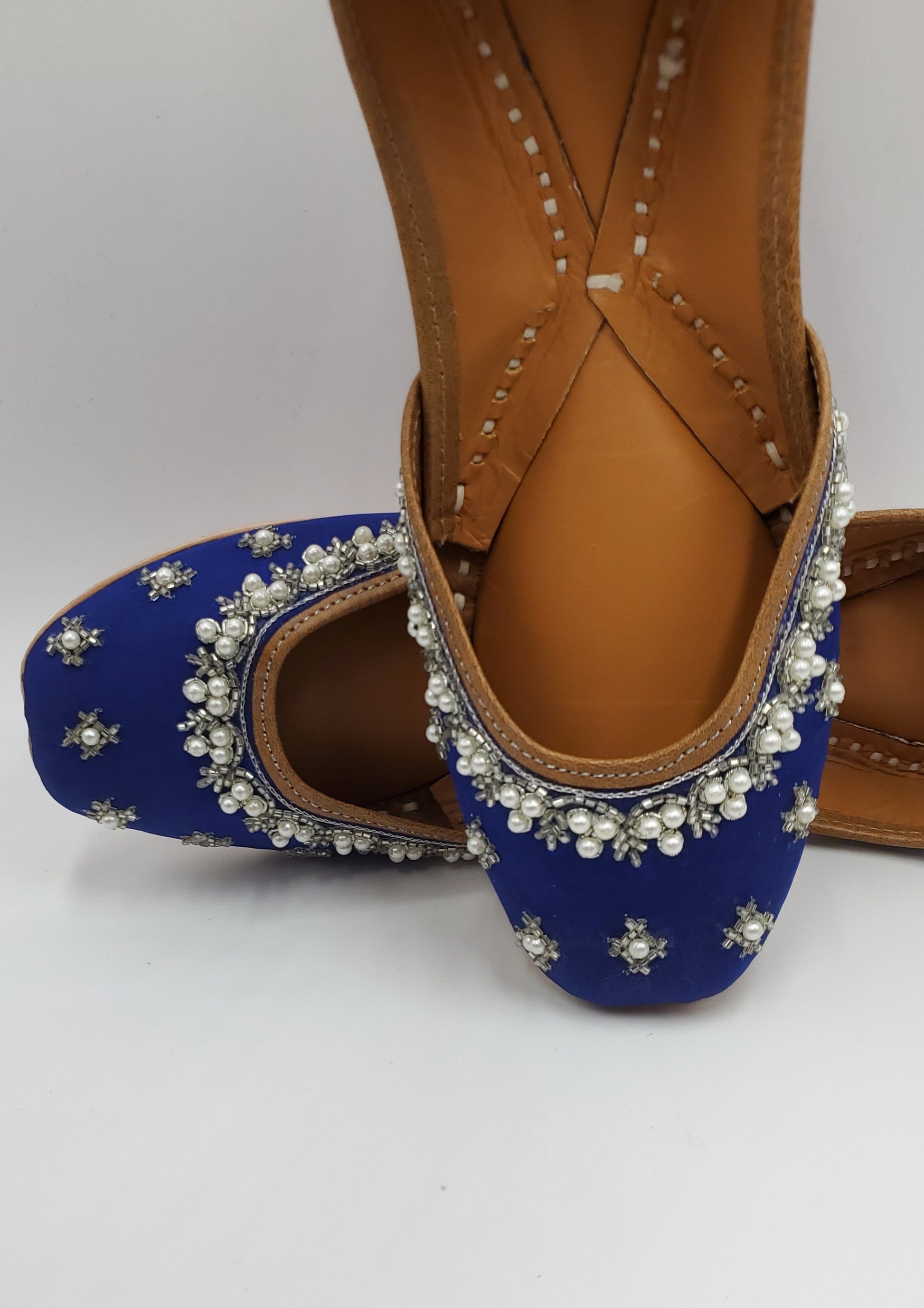 Royal blue jutti beautifully handcrafted with white pearls and embellished with beads. The interior is made of genuine leather and double cushioned making the jutti very comfertable to wear.