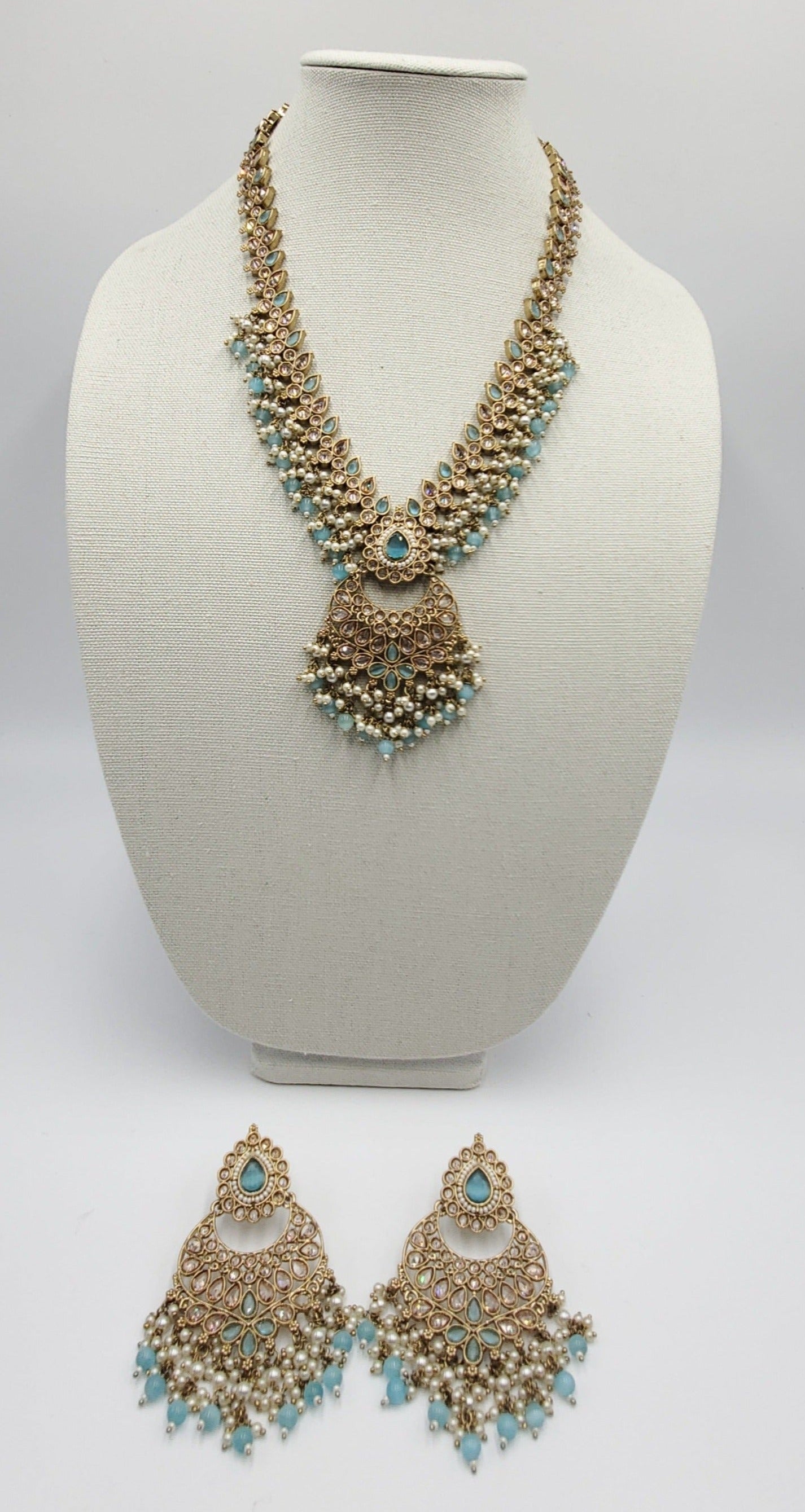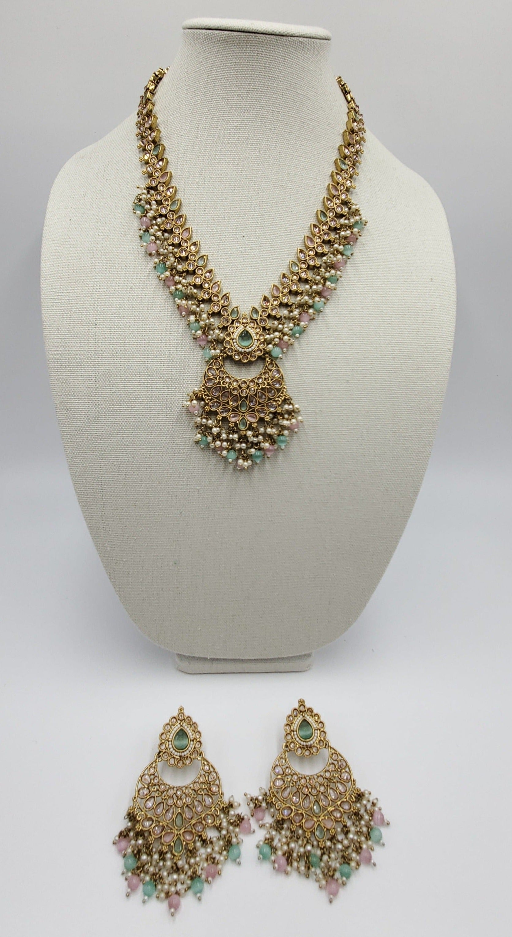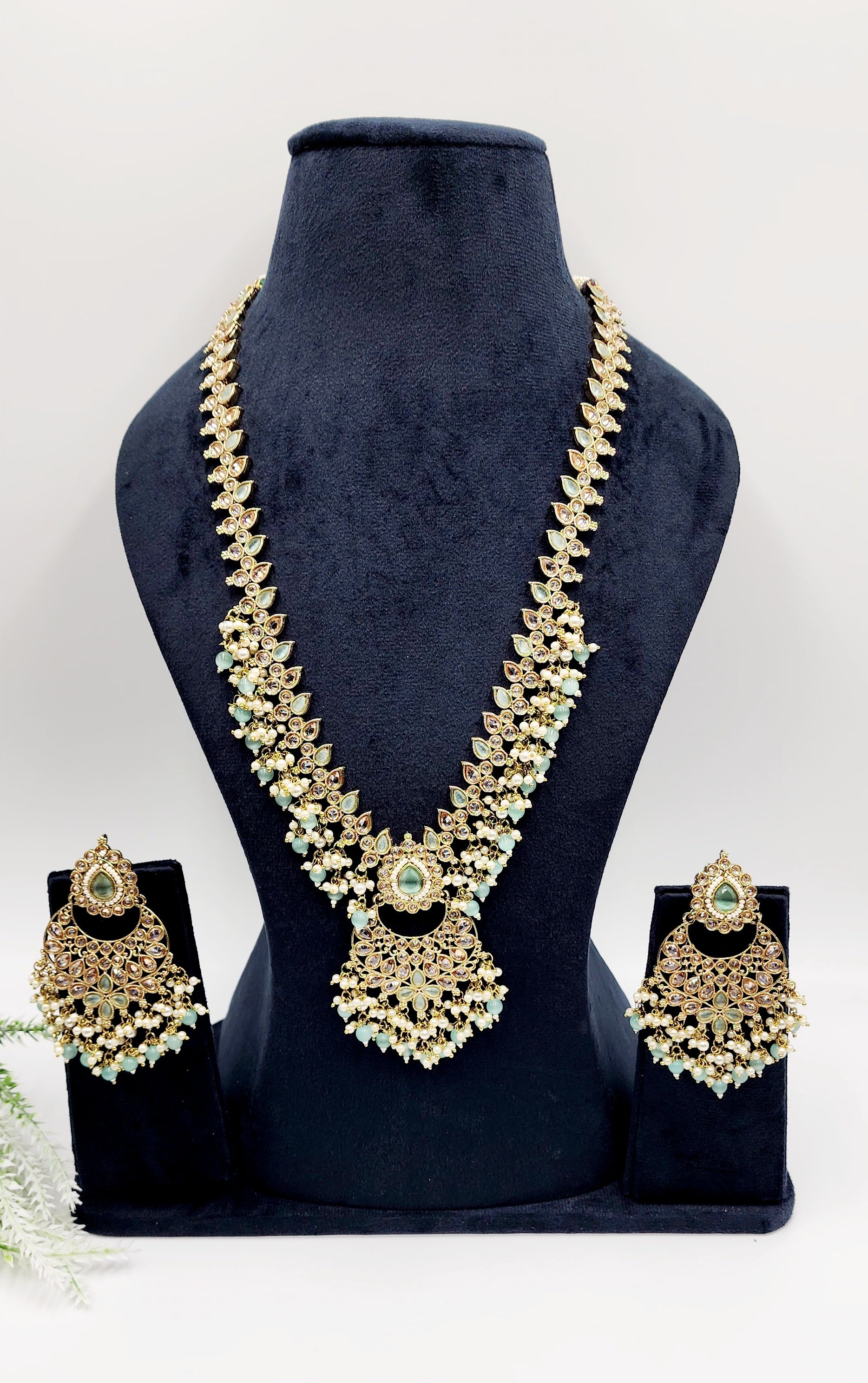 Gold Tone Long Necklace Set with Polki , faux Pearls and Beeds.