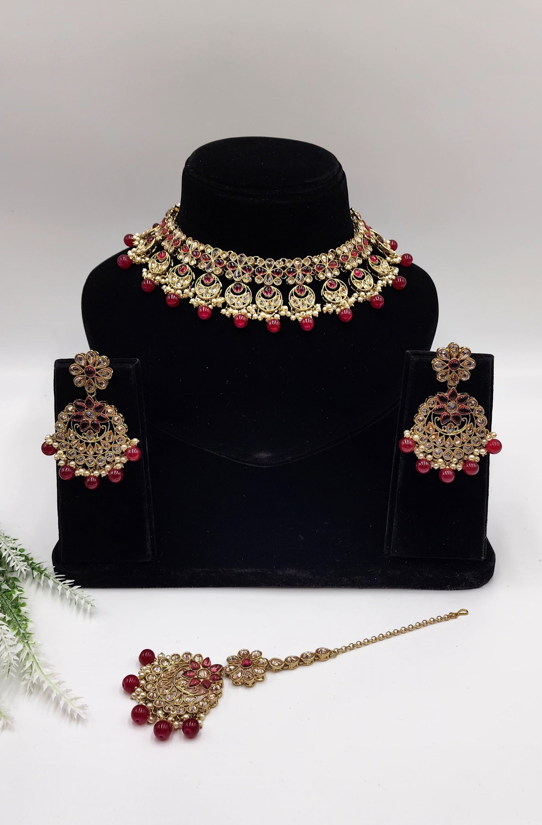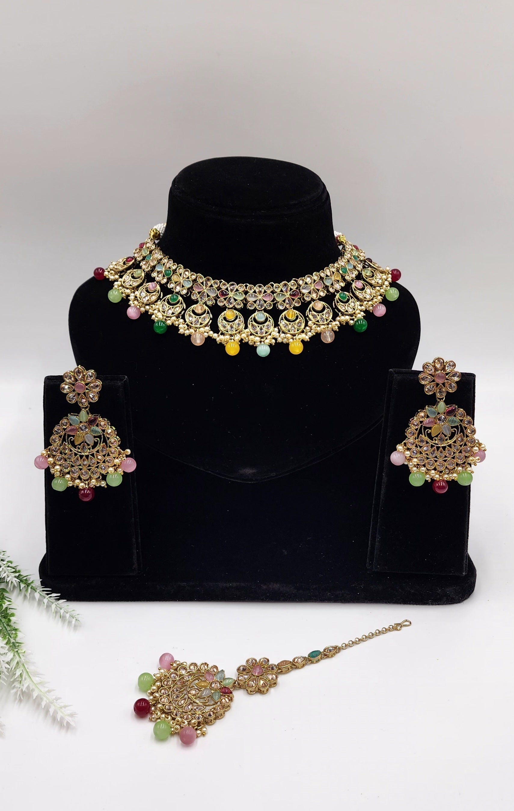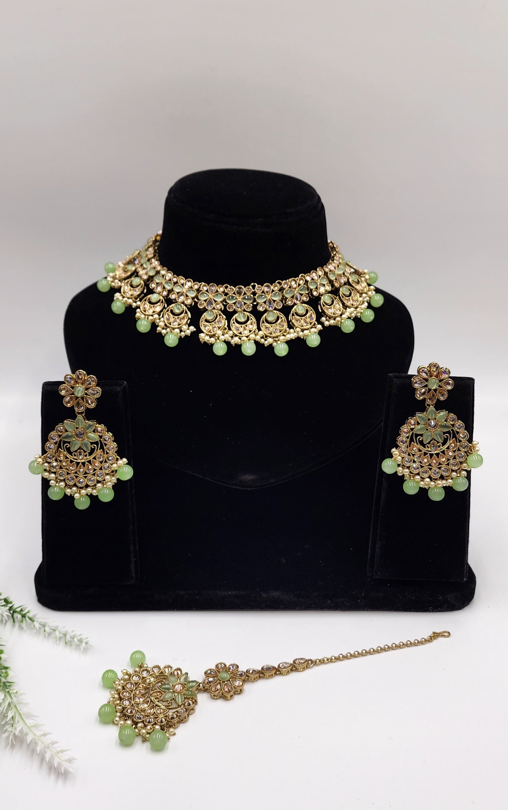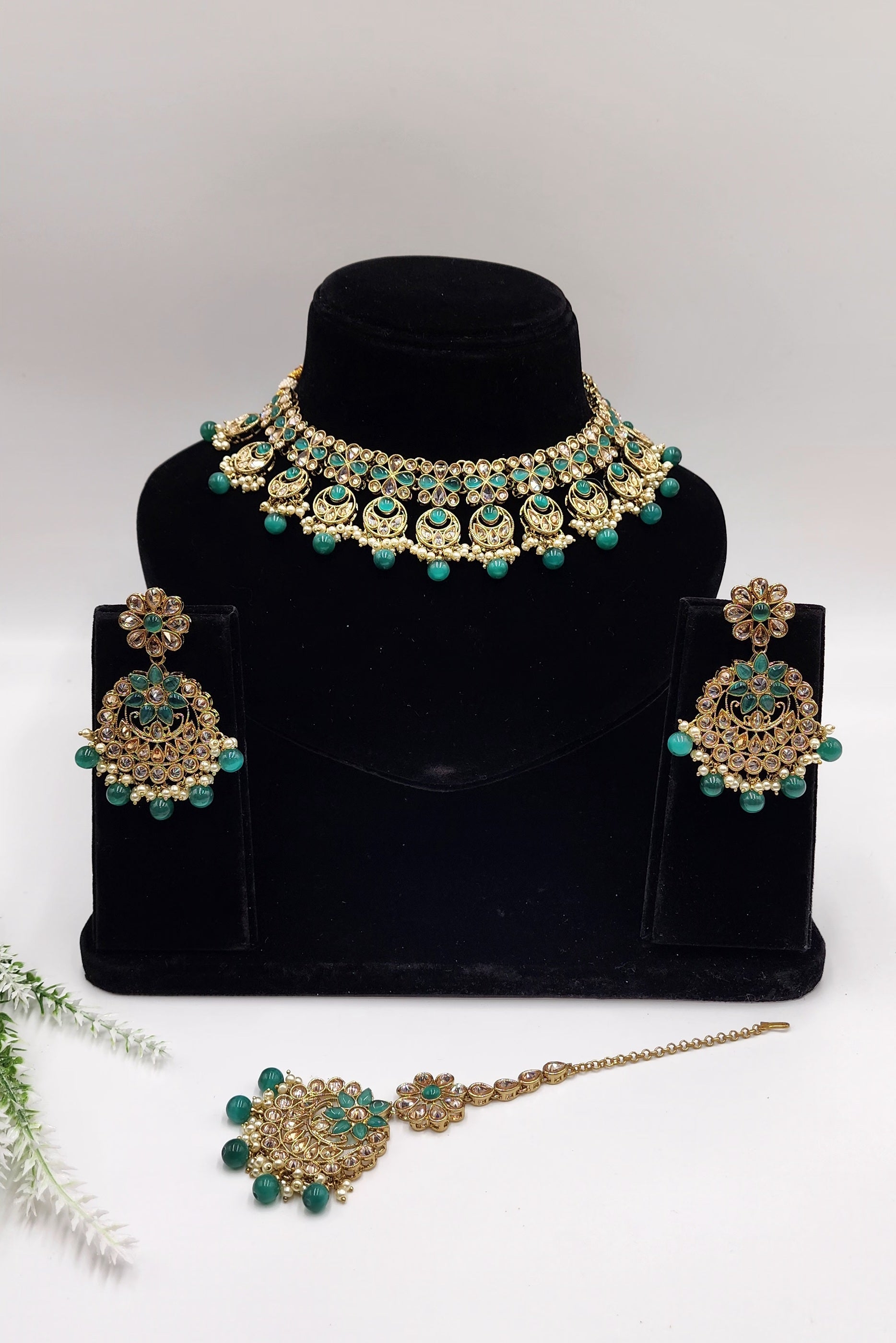 Gold tone semi bridal set simulated with Pearl's and Beads.