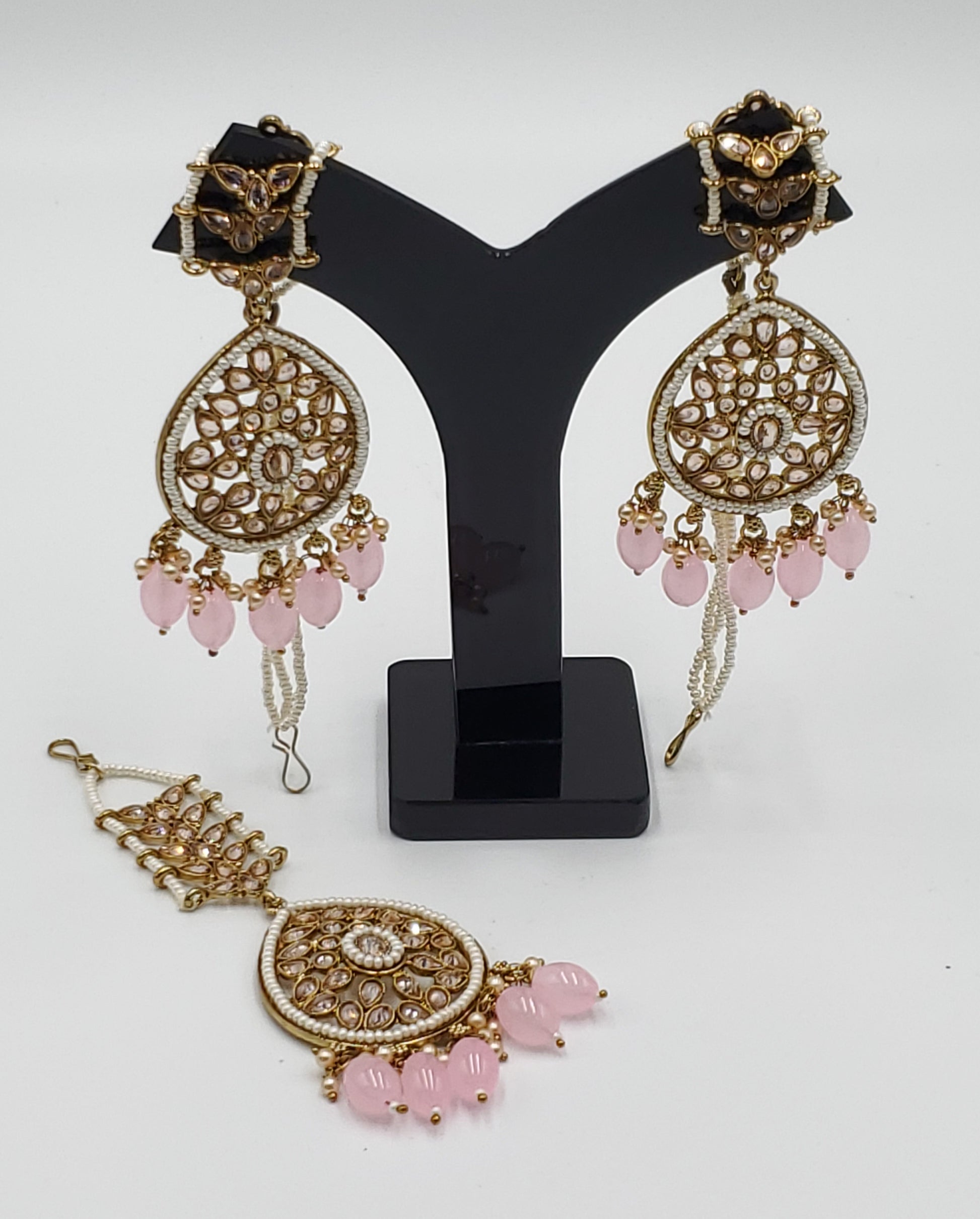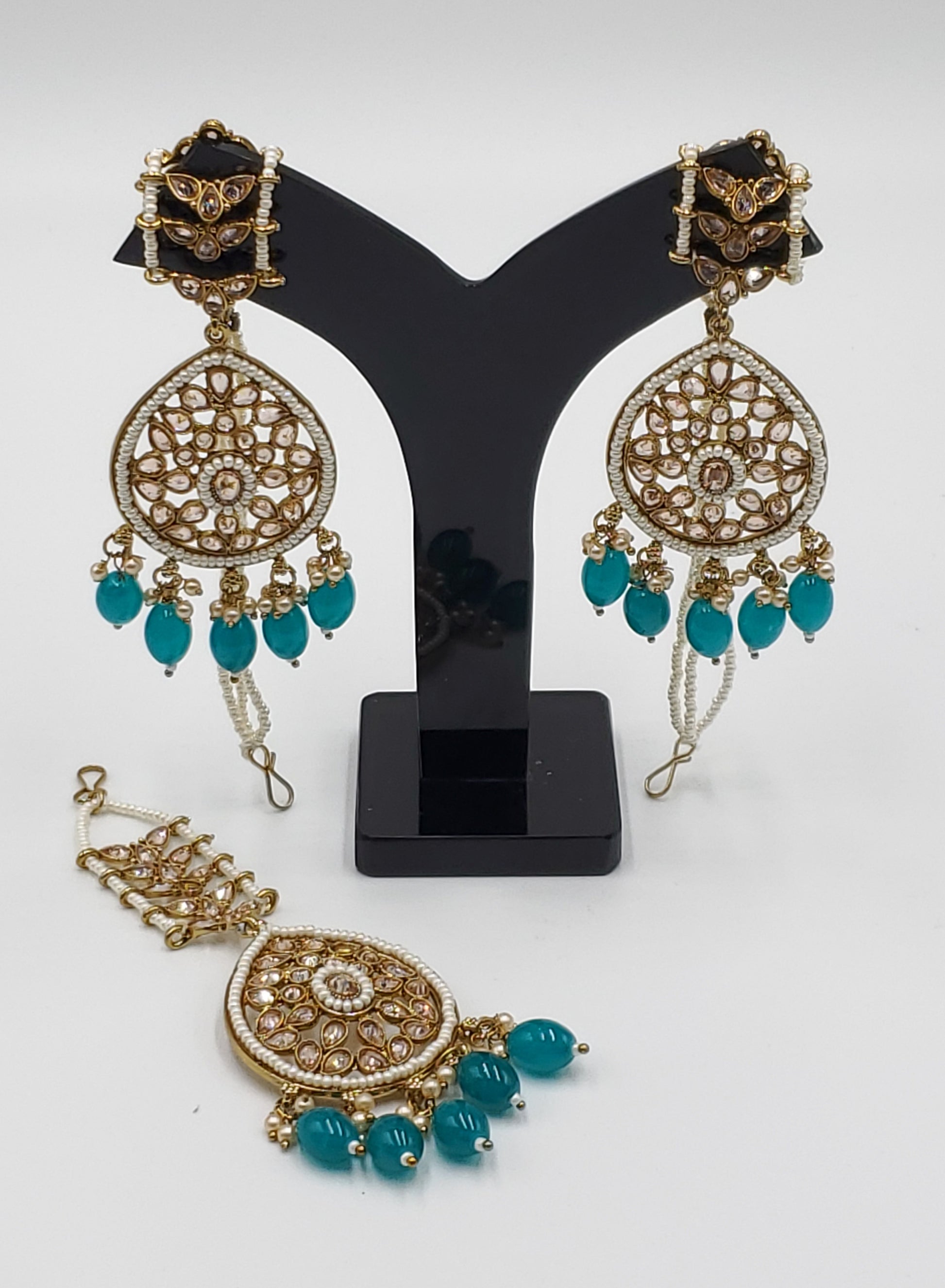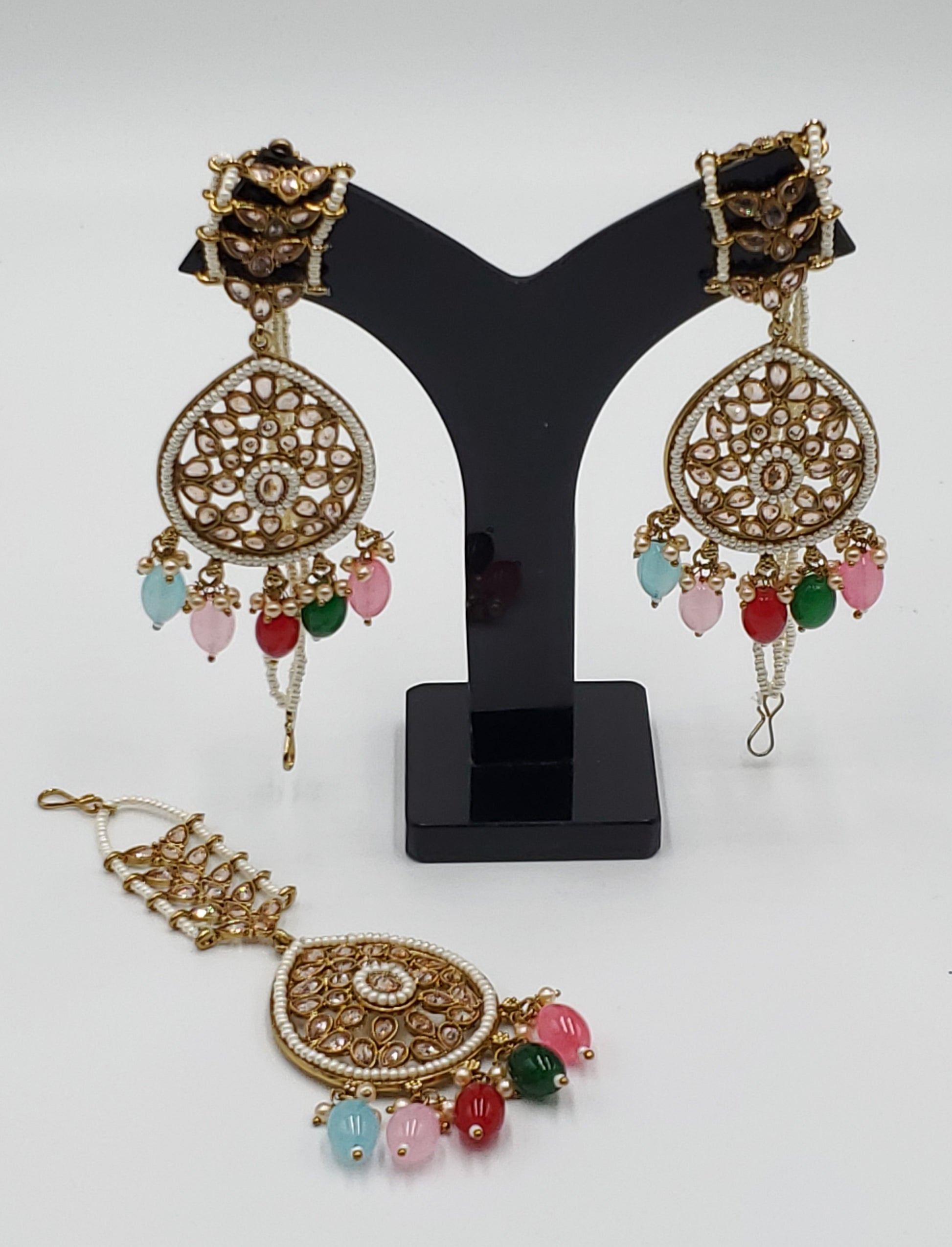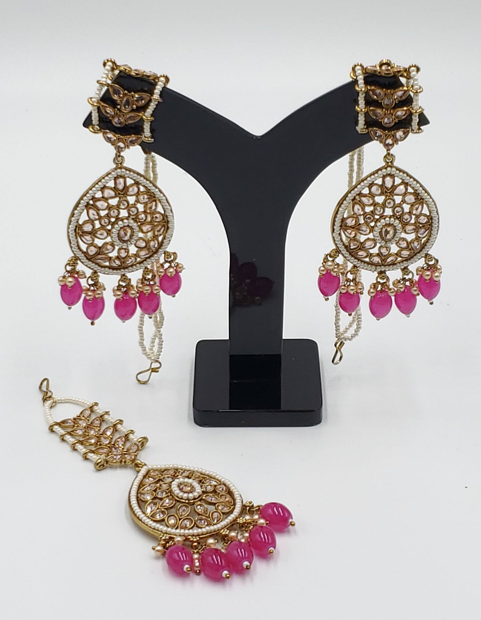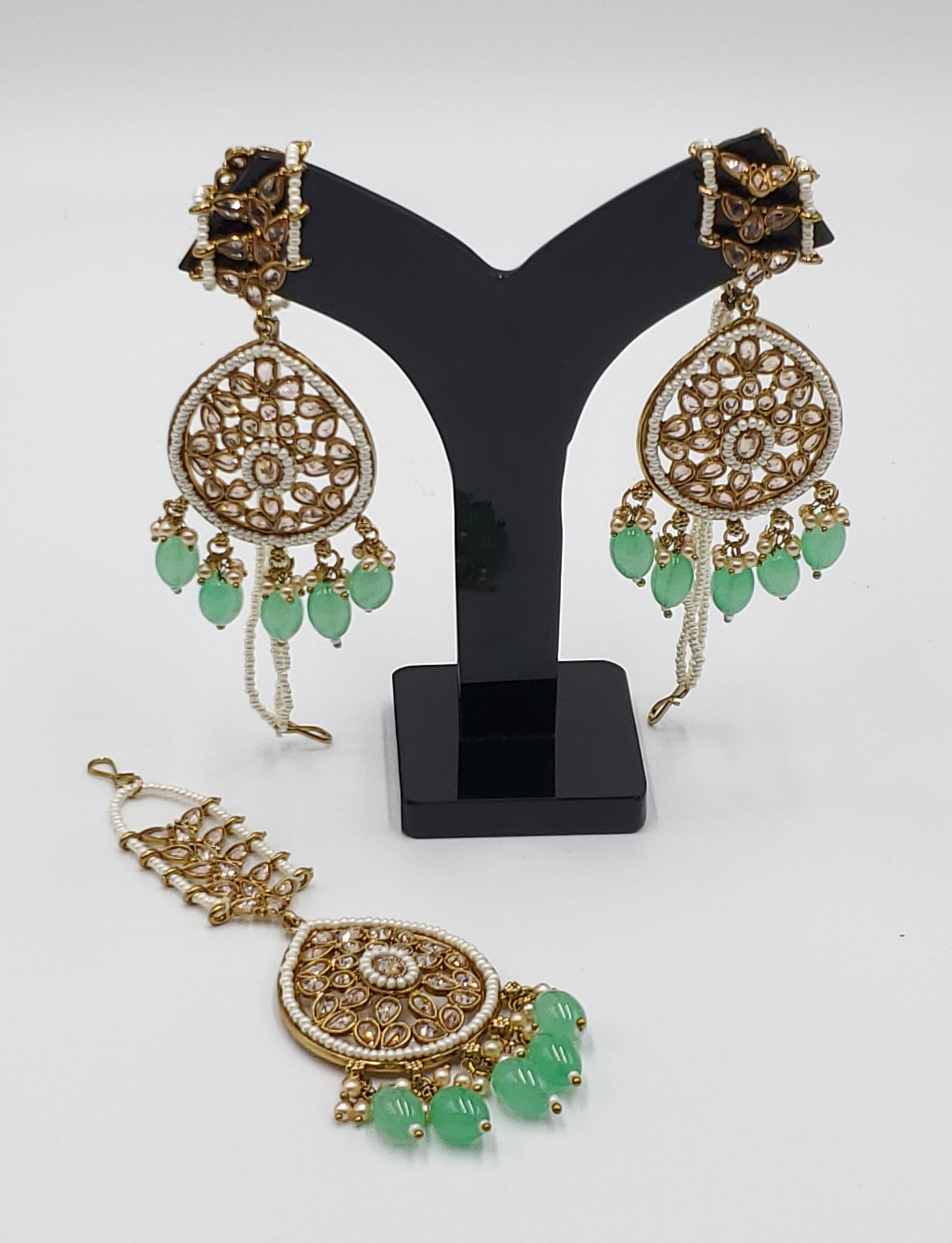 Gold Tone Earrings Tikka With Ear Support Chain, Simulated Polki Faux Pearl Color Stones and Beeds.