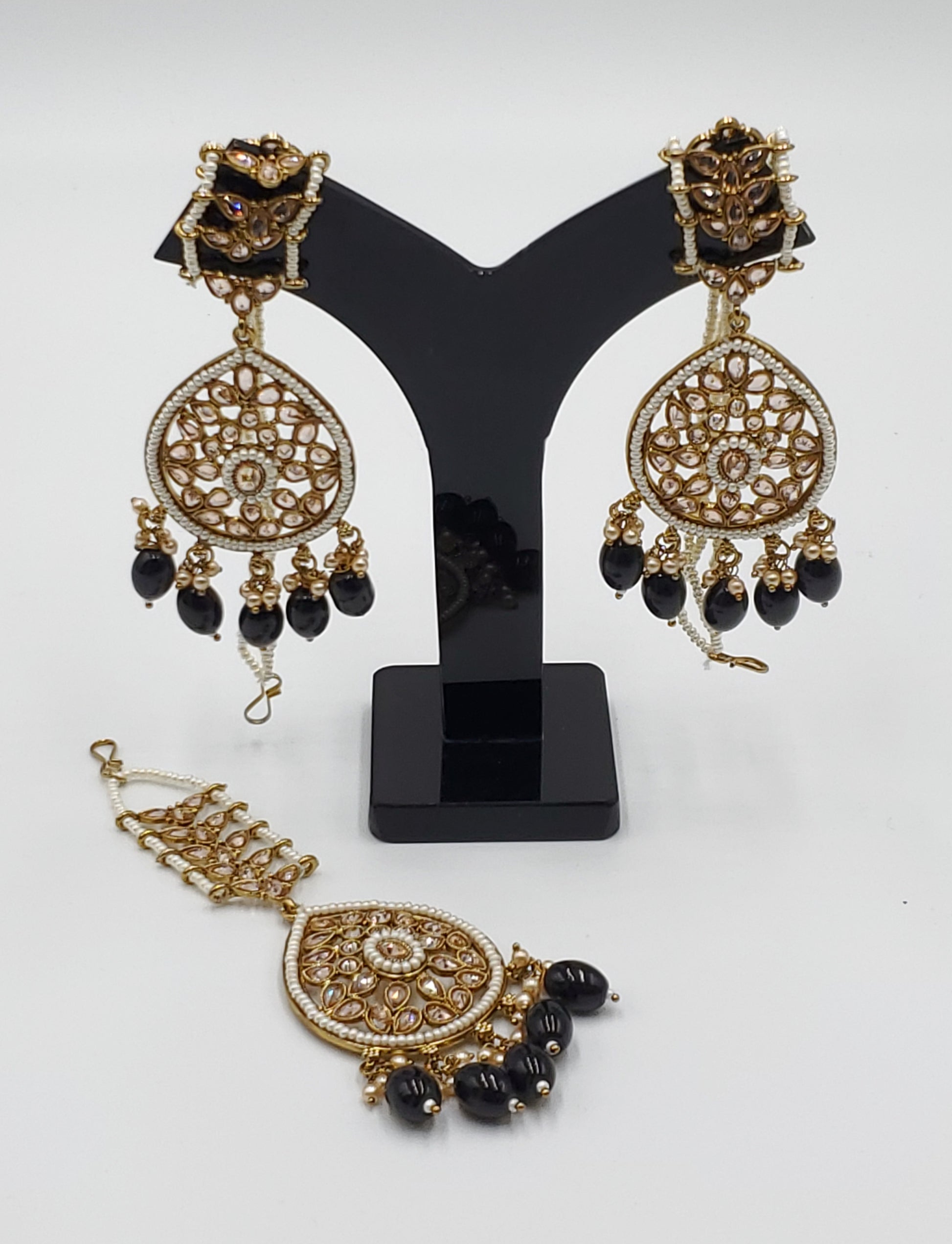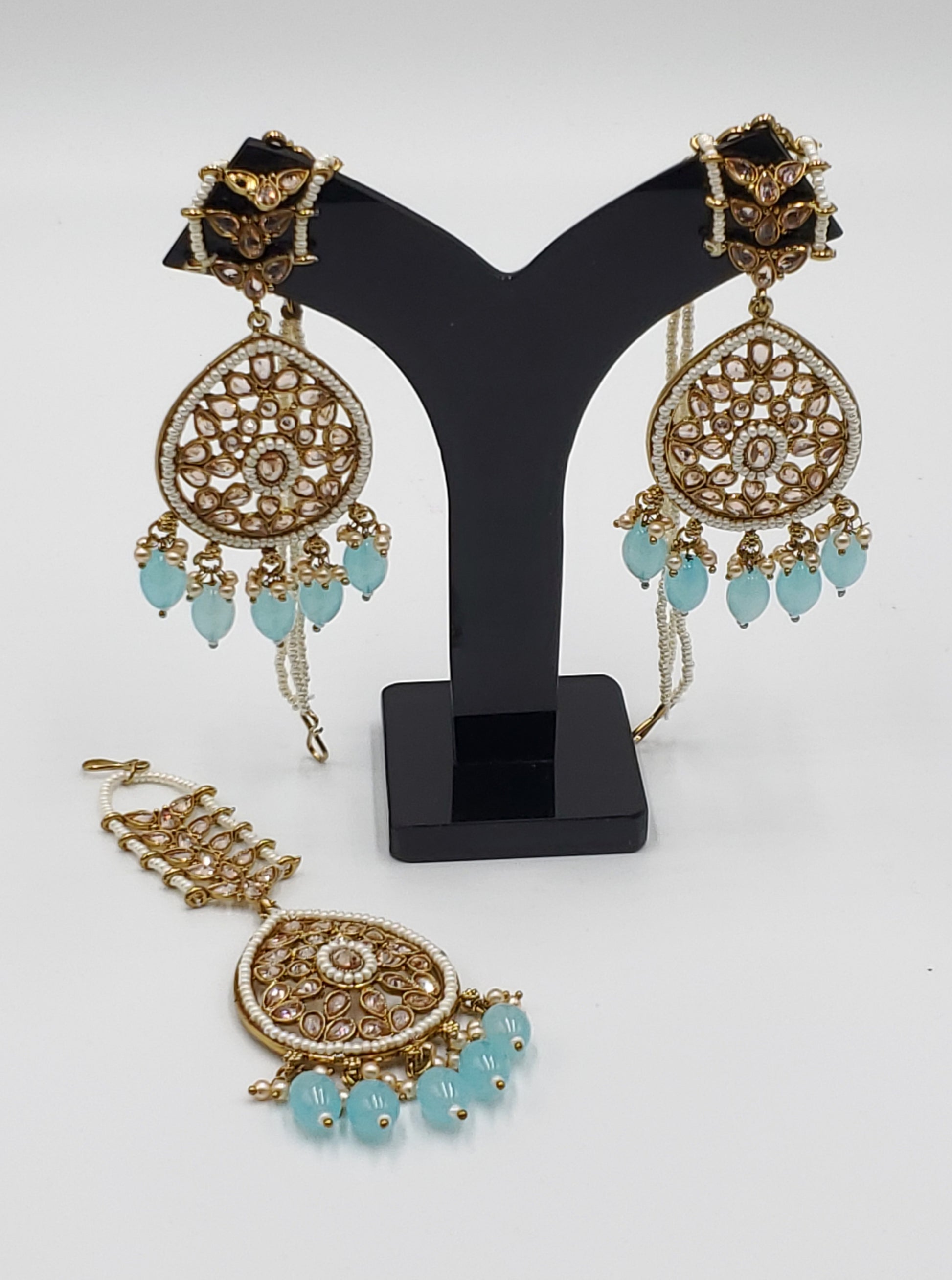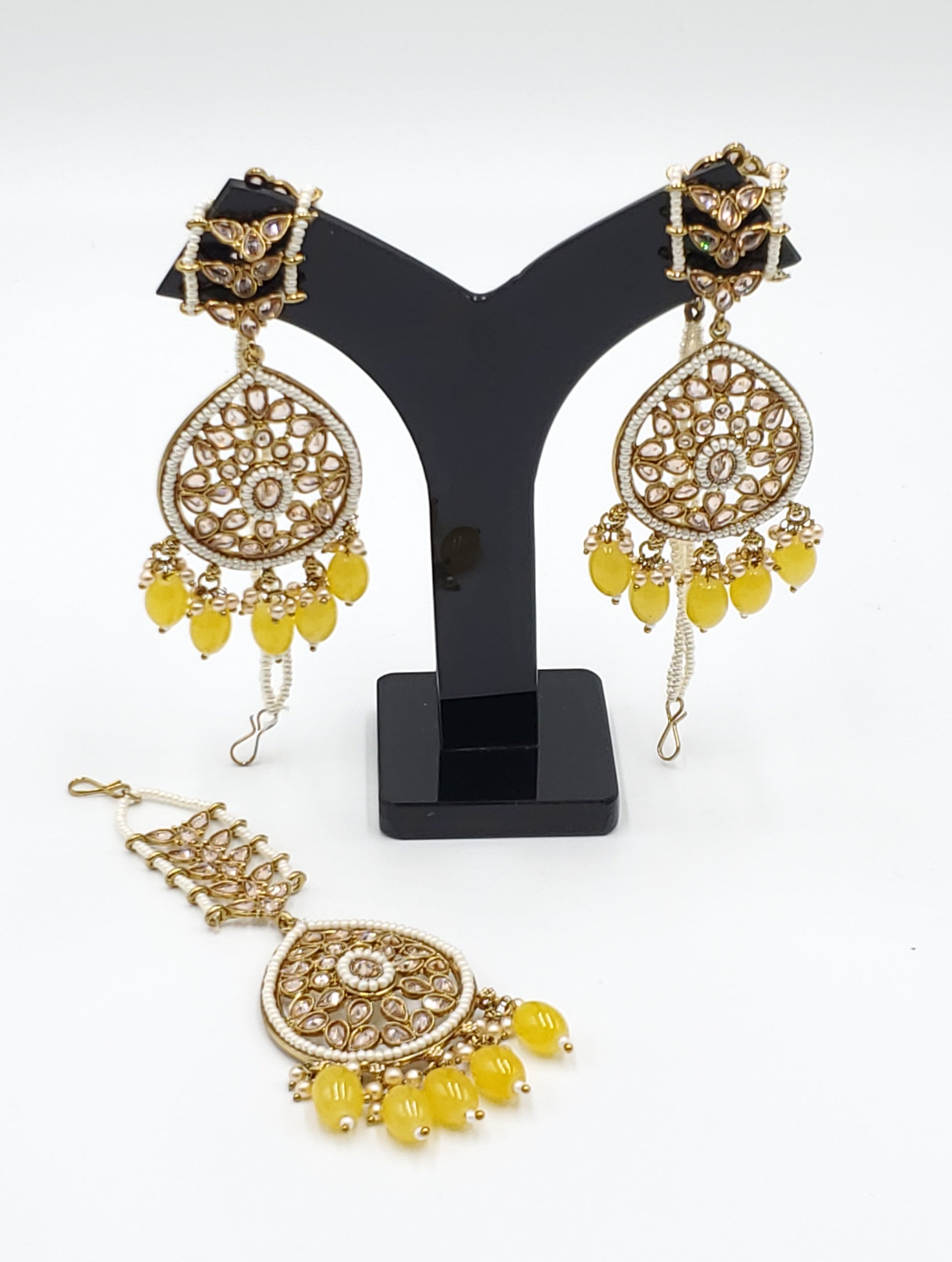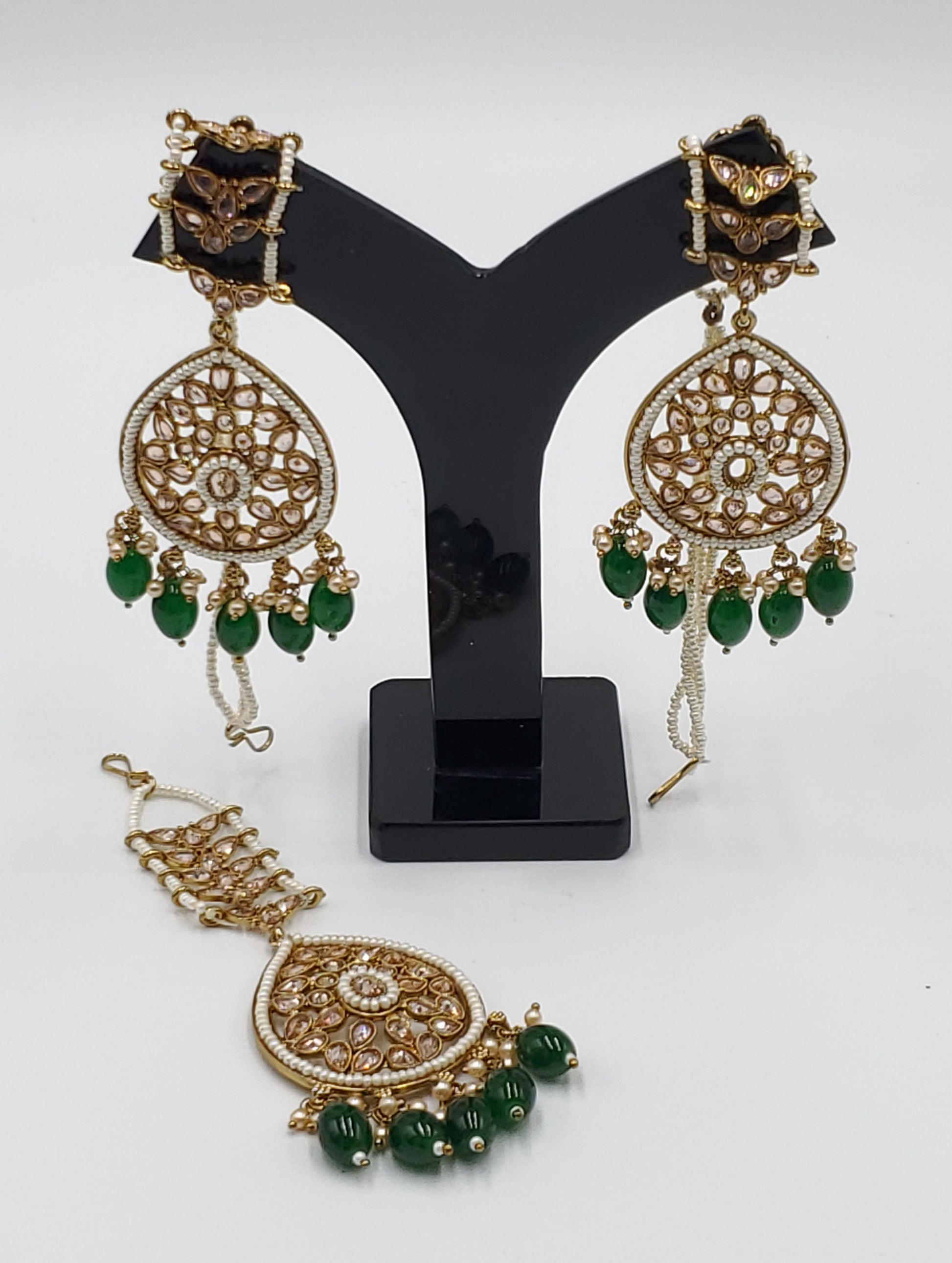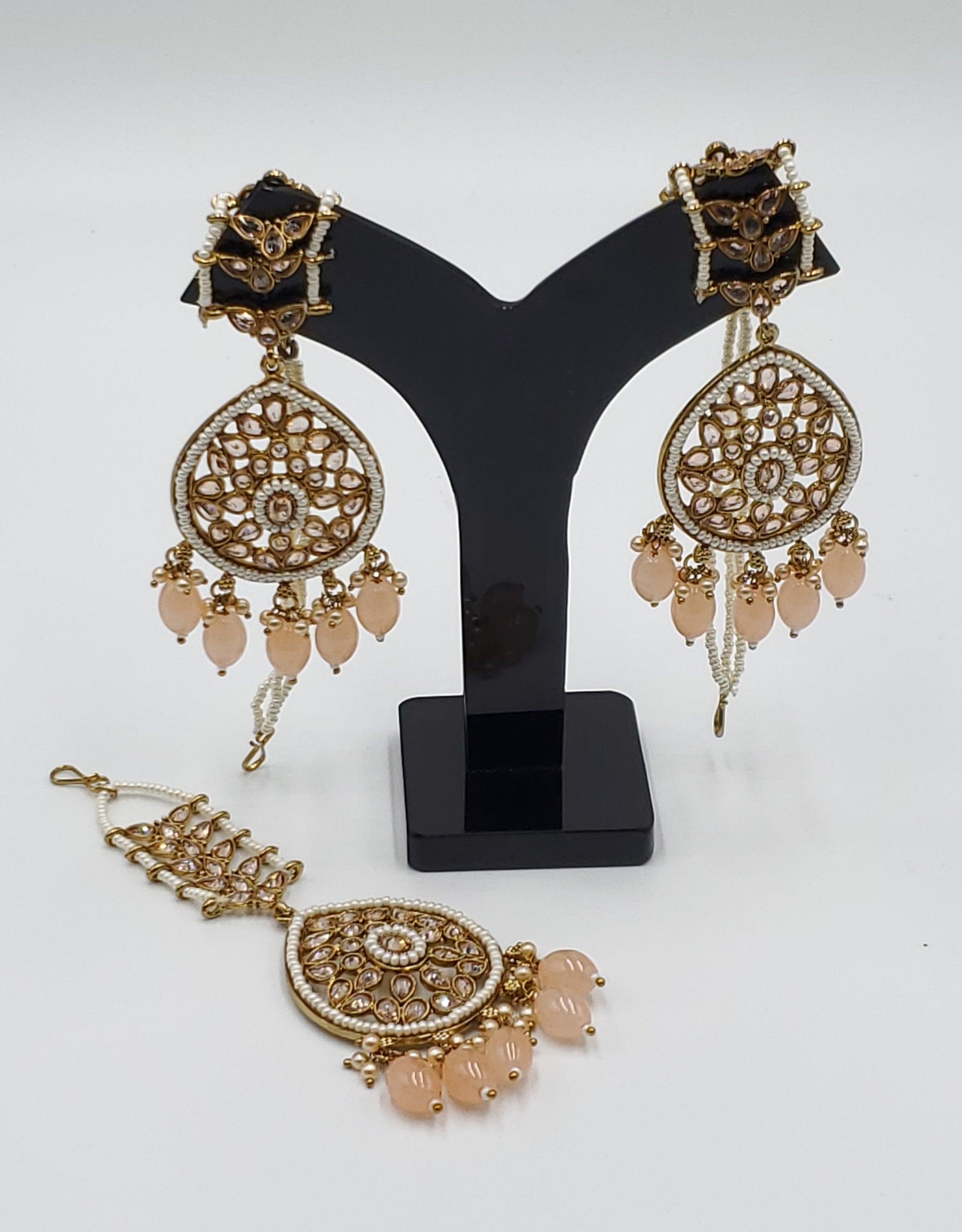 Gold Tone Earrings Tikka With Ear Support Chain, Simulated Polki Faux Pearl Color Stones and Beeds.