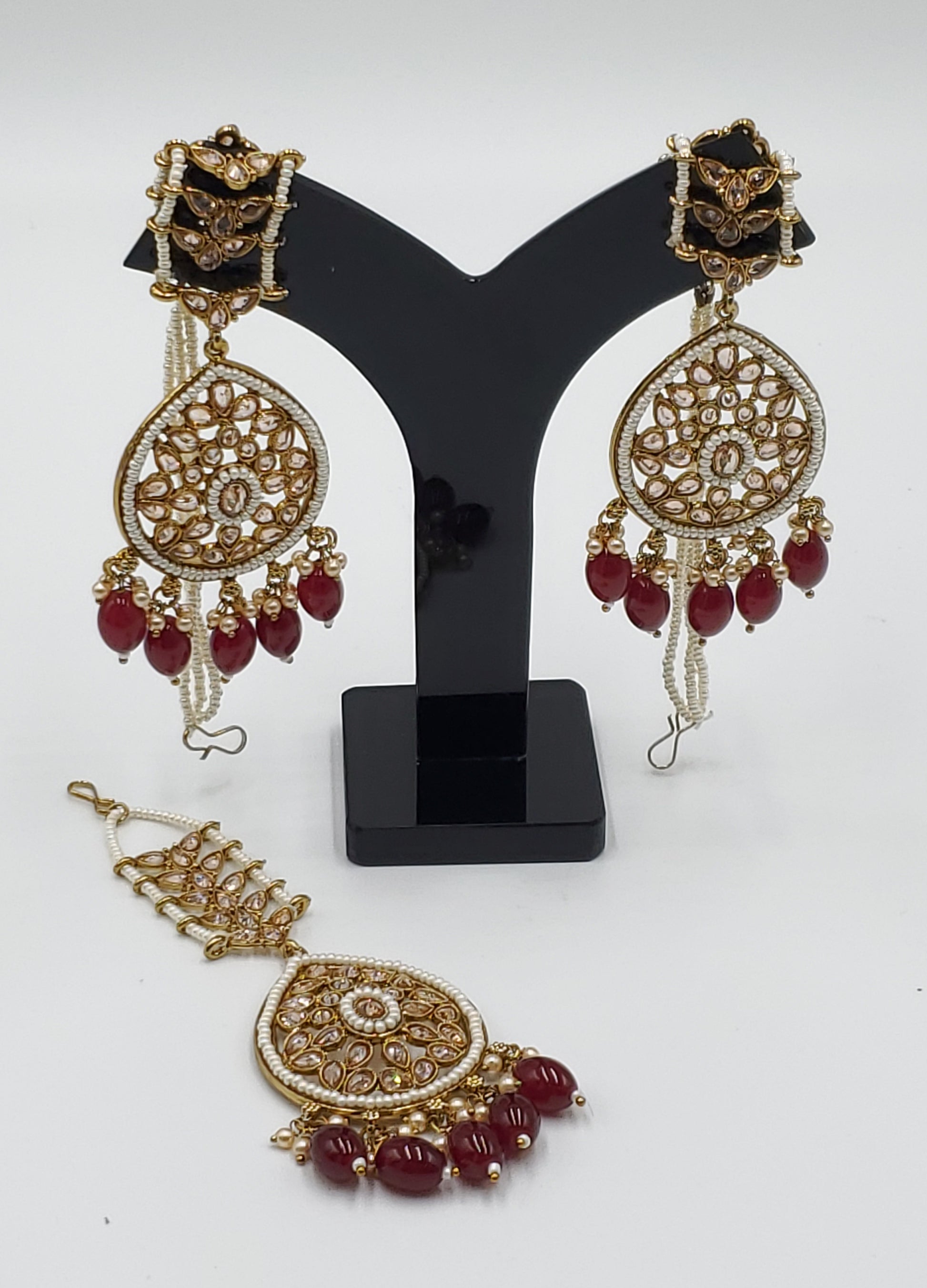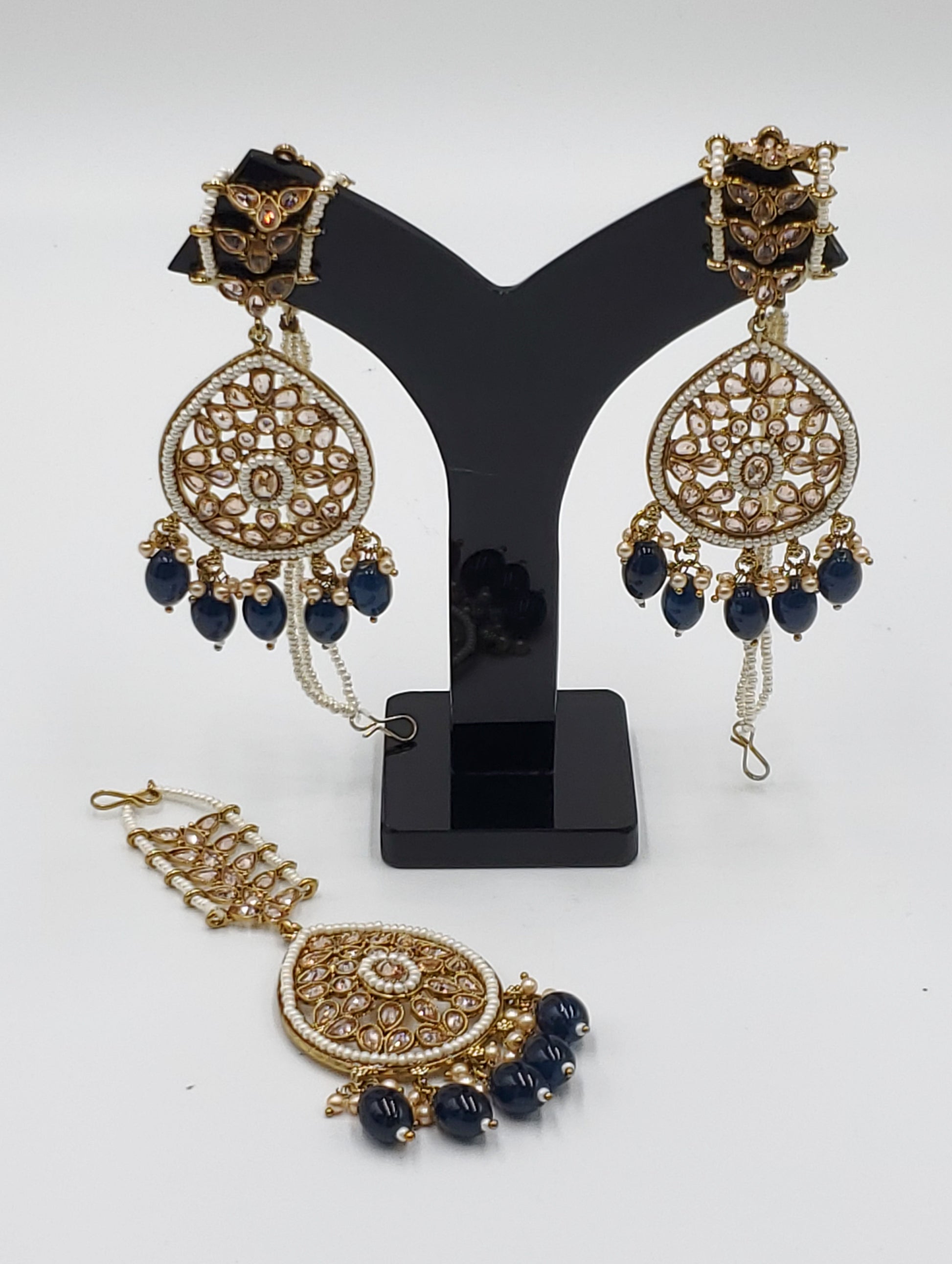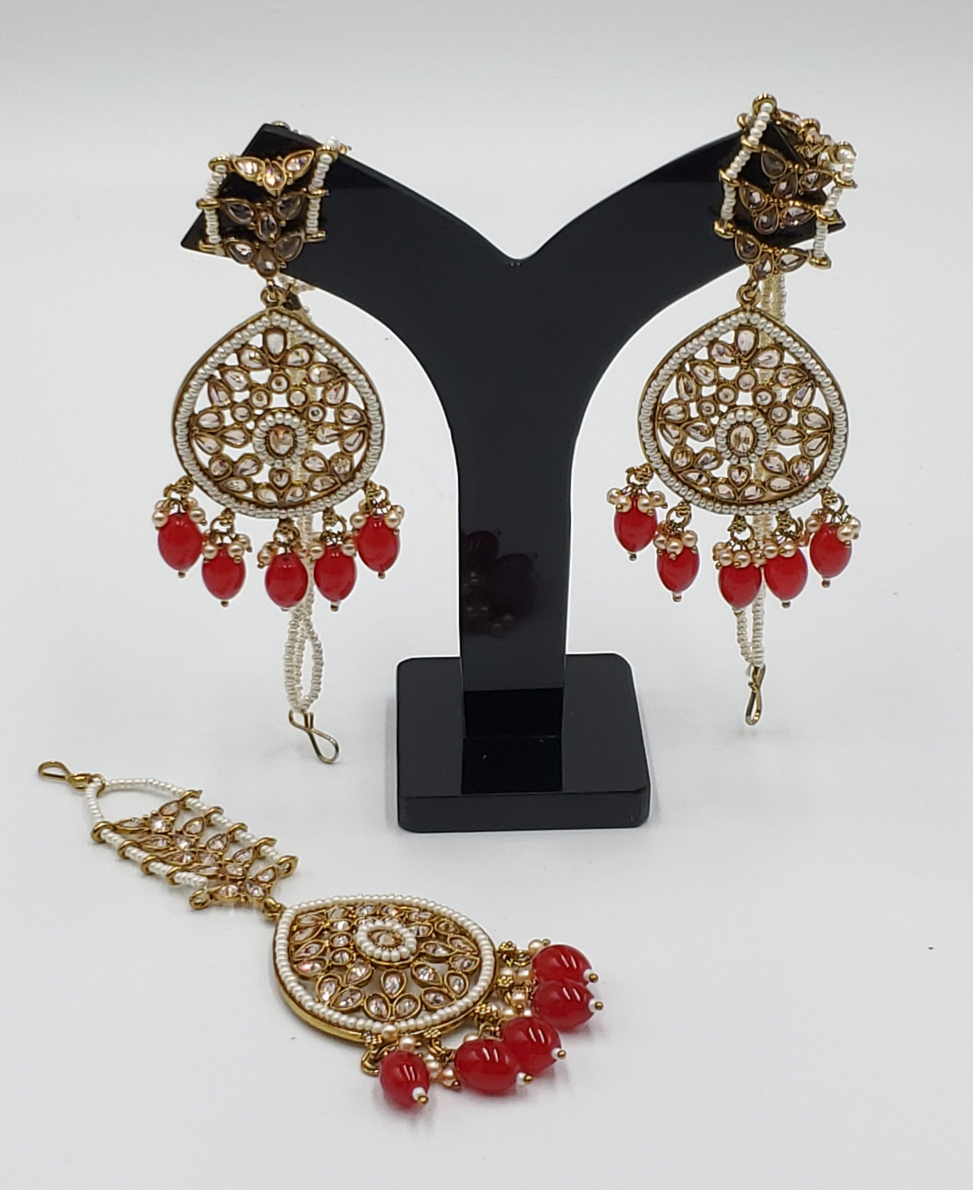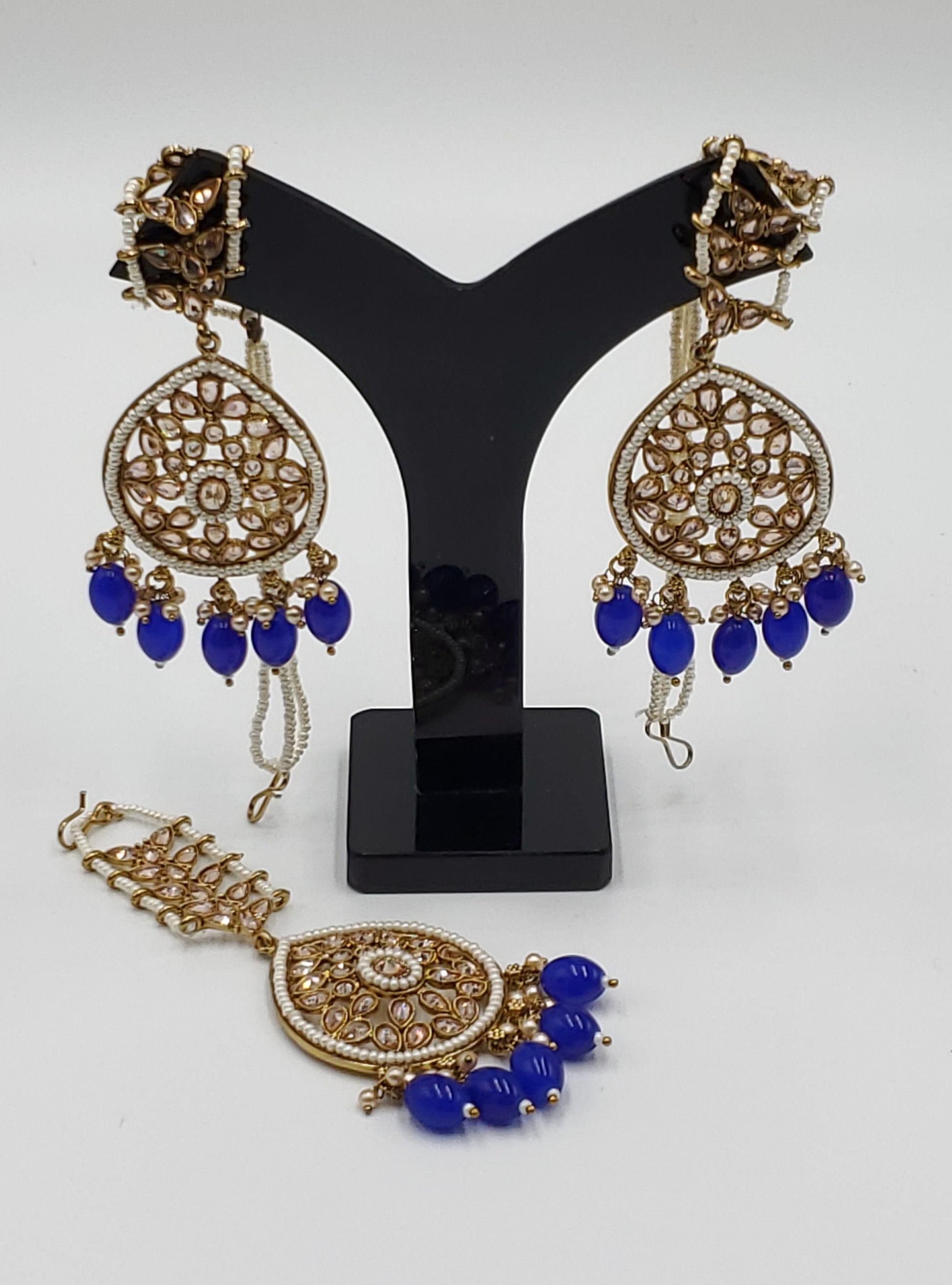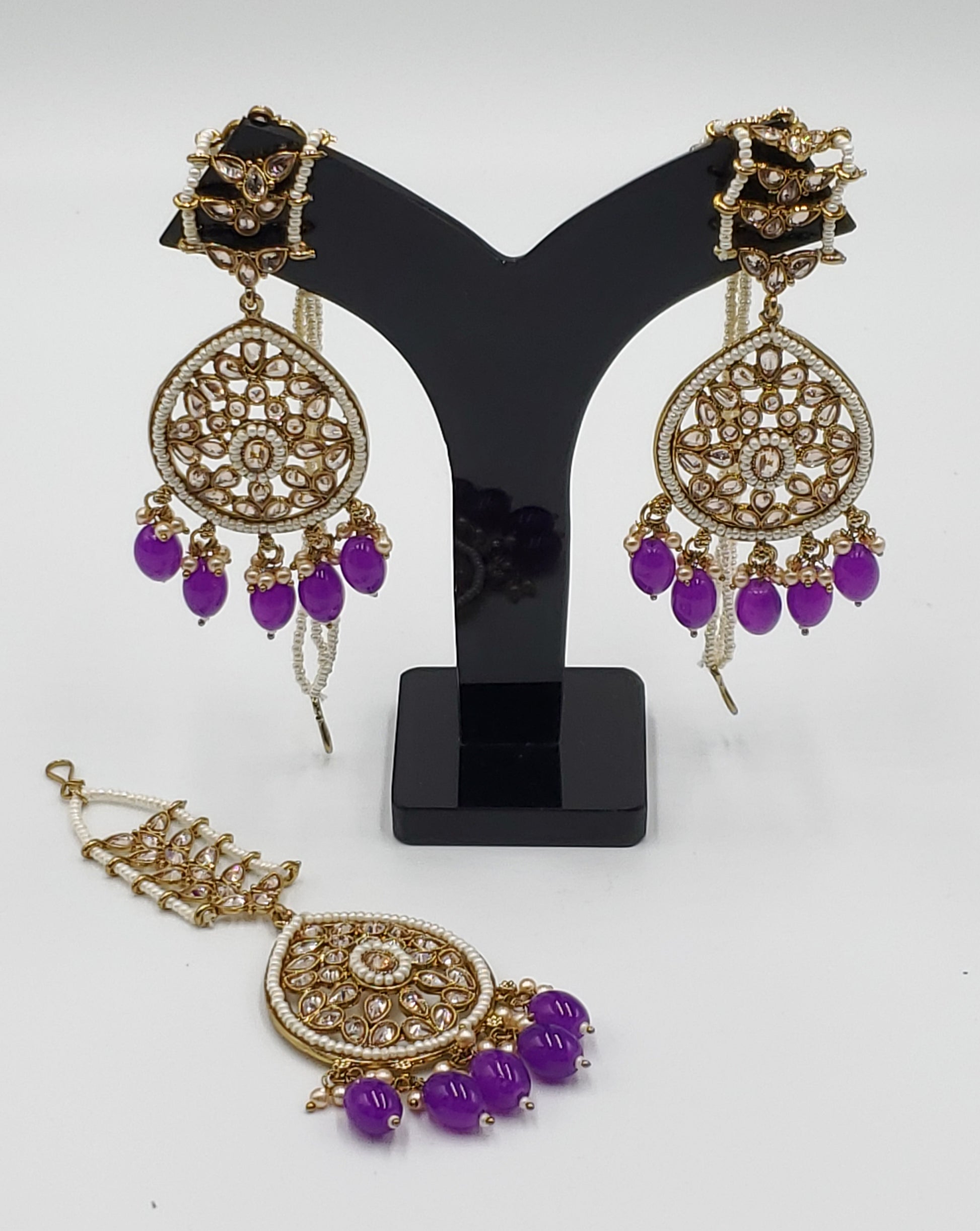 Gold Tone Earrings Tikka With Ear Support Chain, Simulated Polki Faux Pearl Color Stones and Beeds.