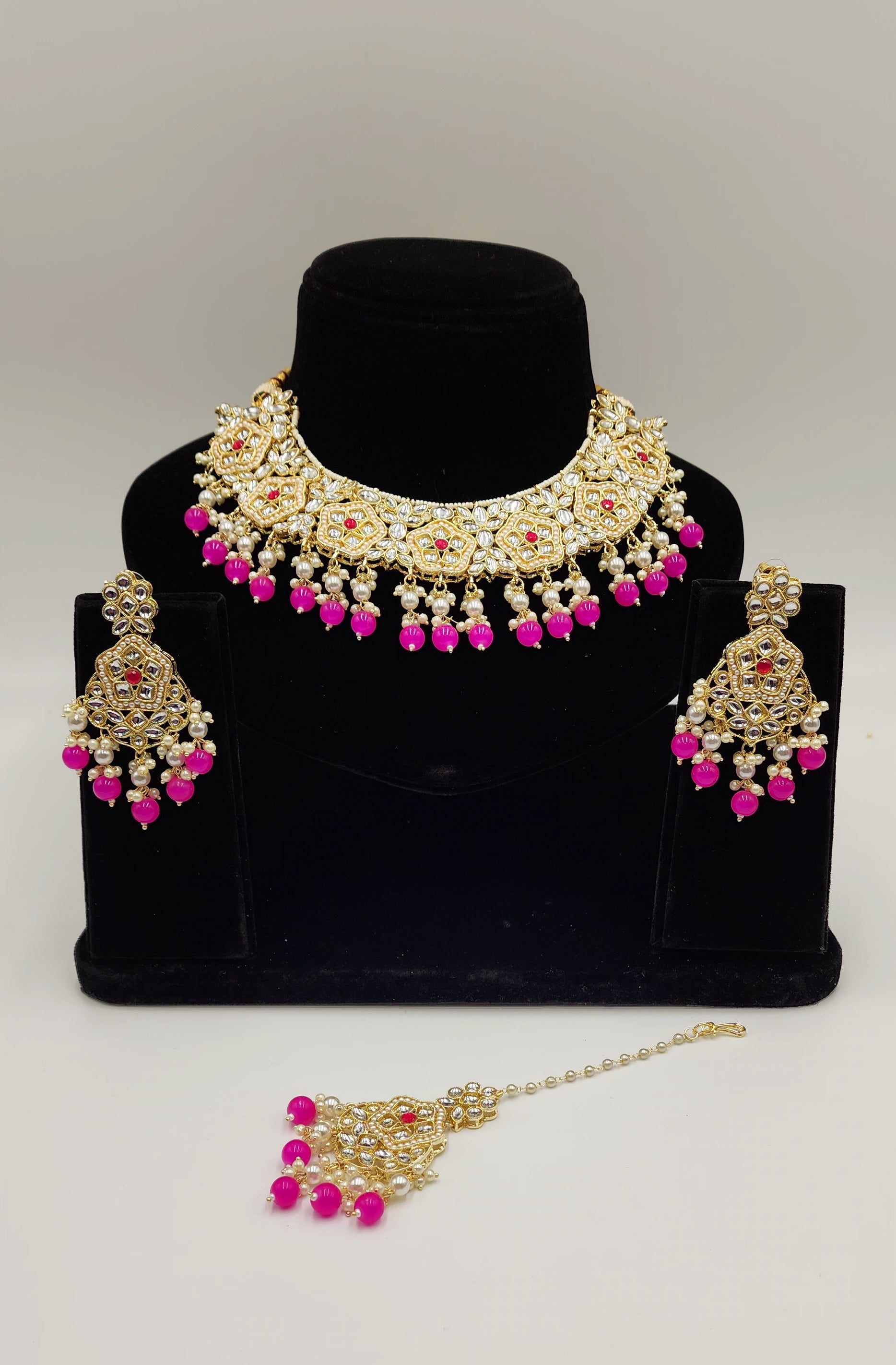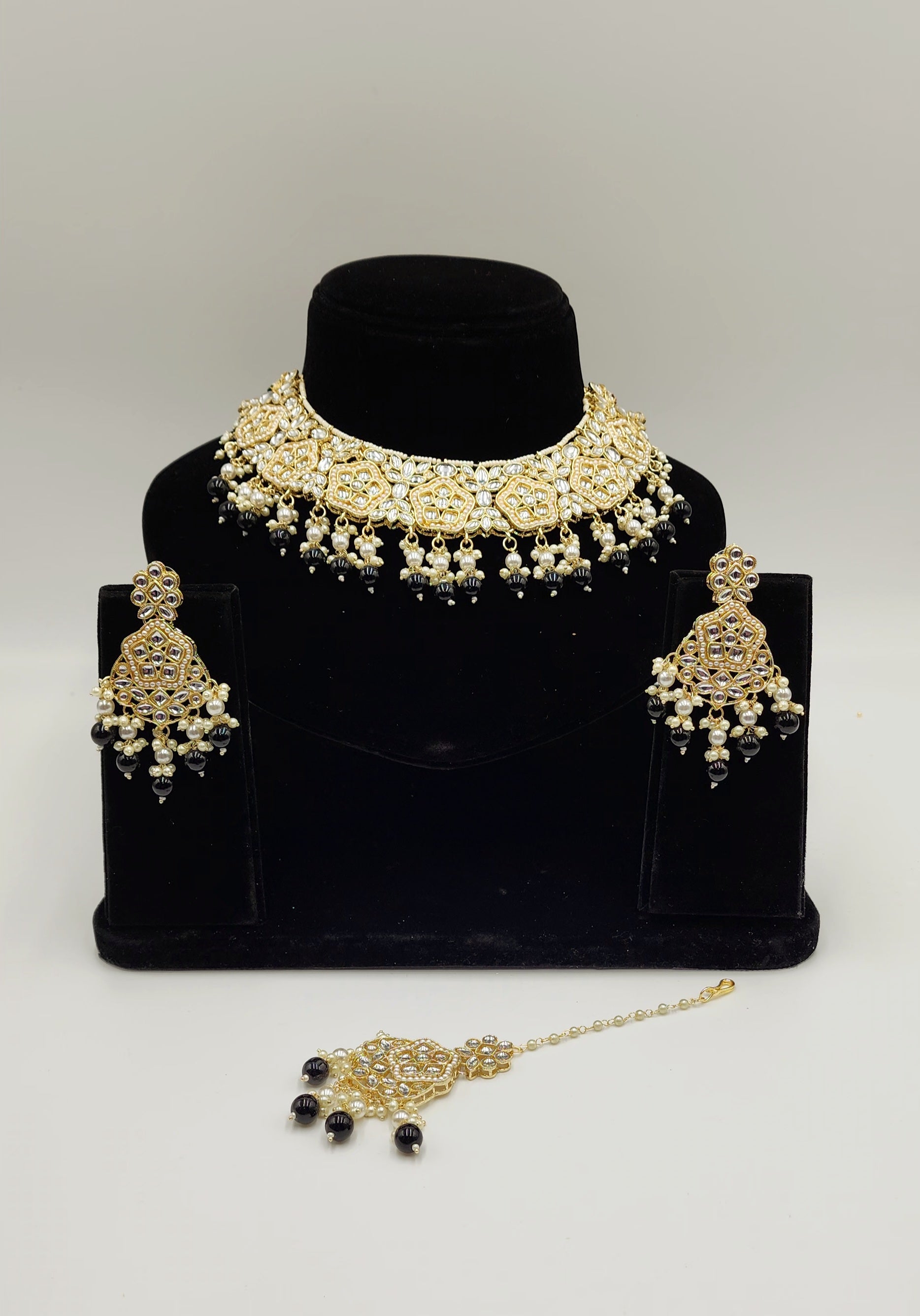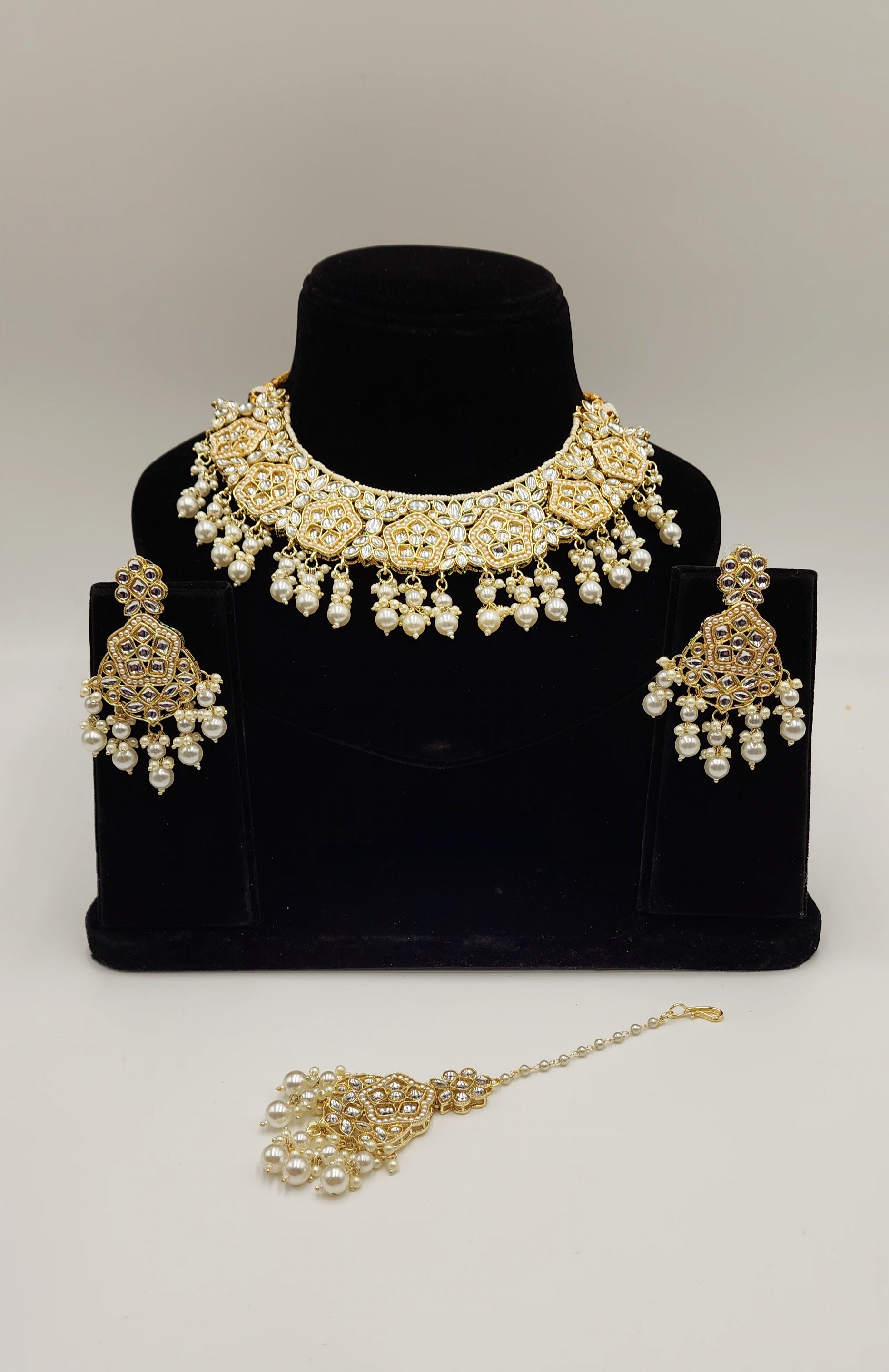Gold Tone kundan set with Faux Pearls and beads.