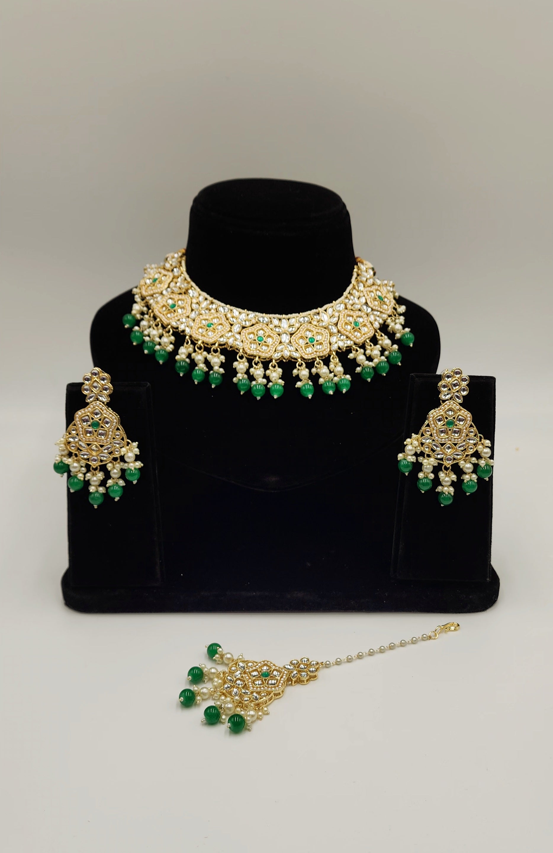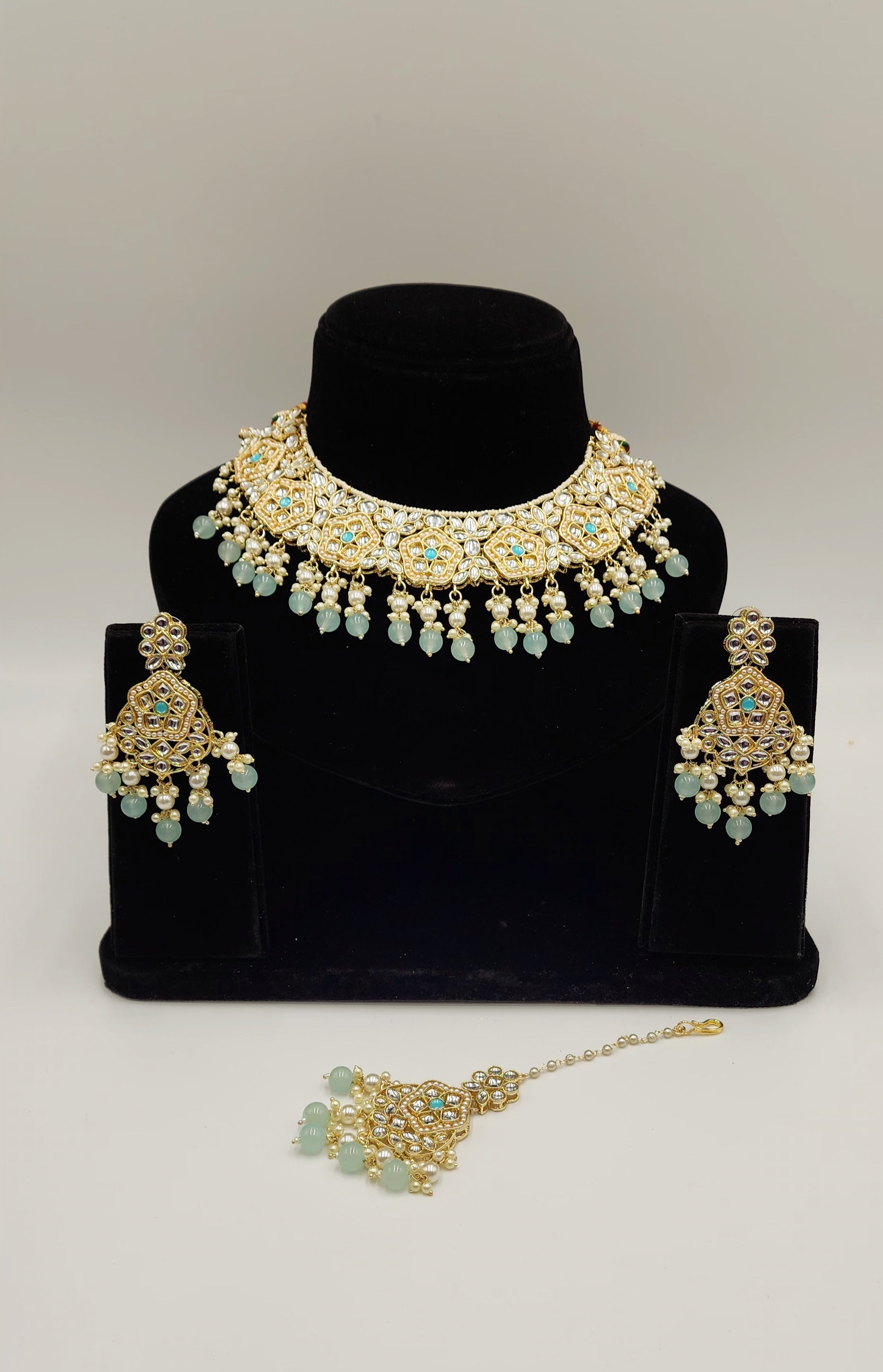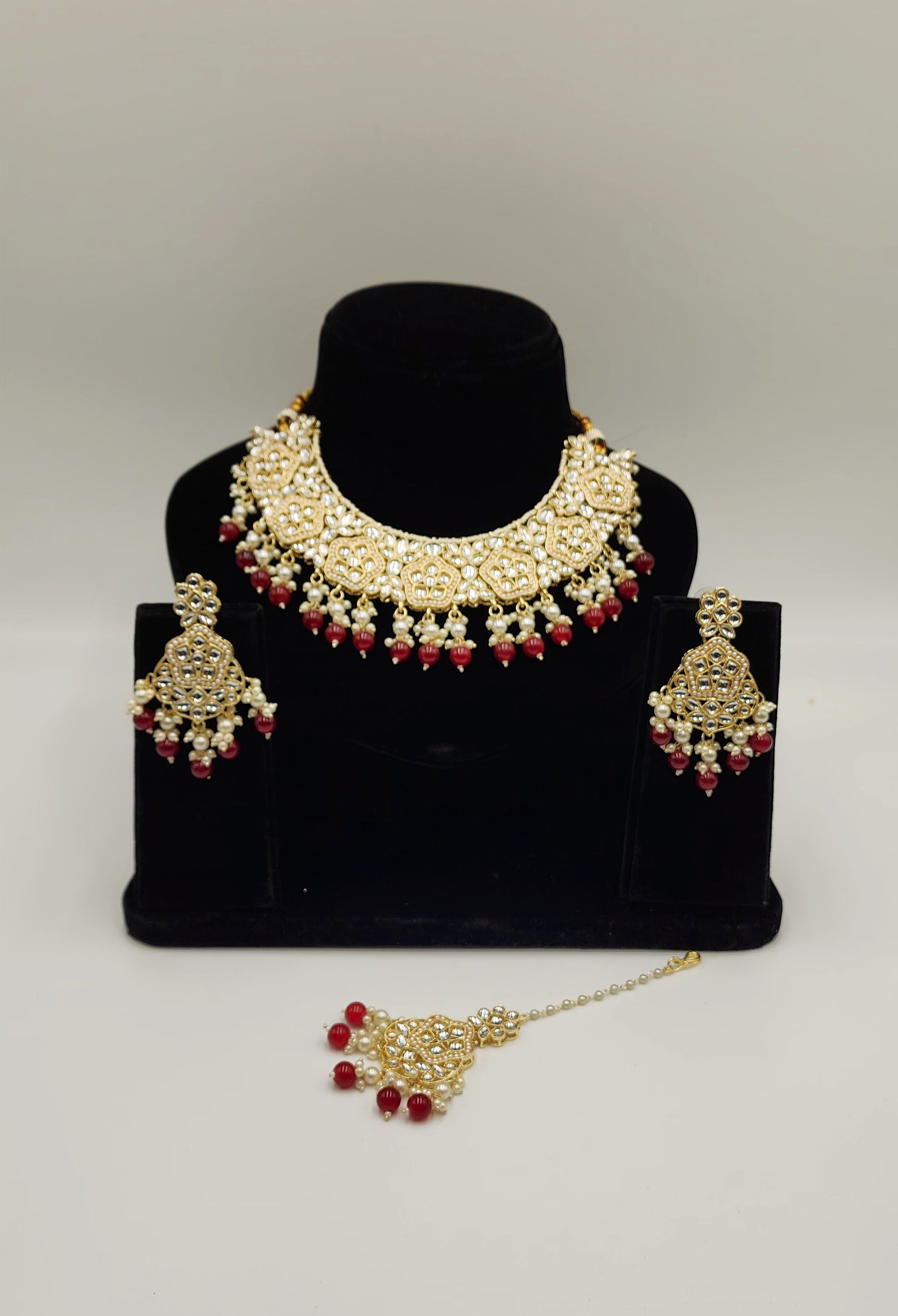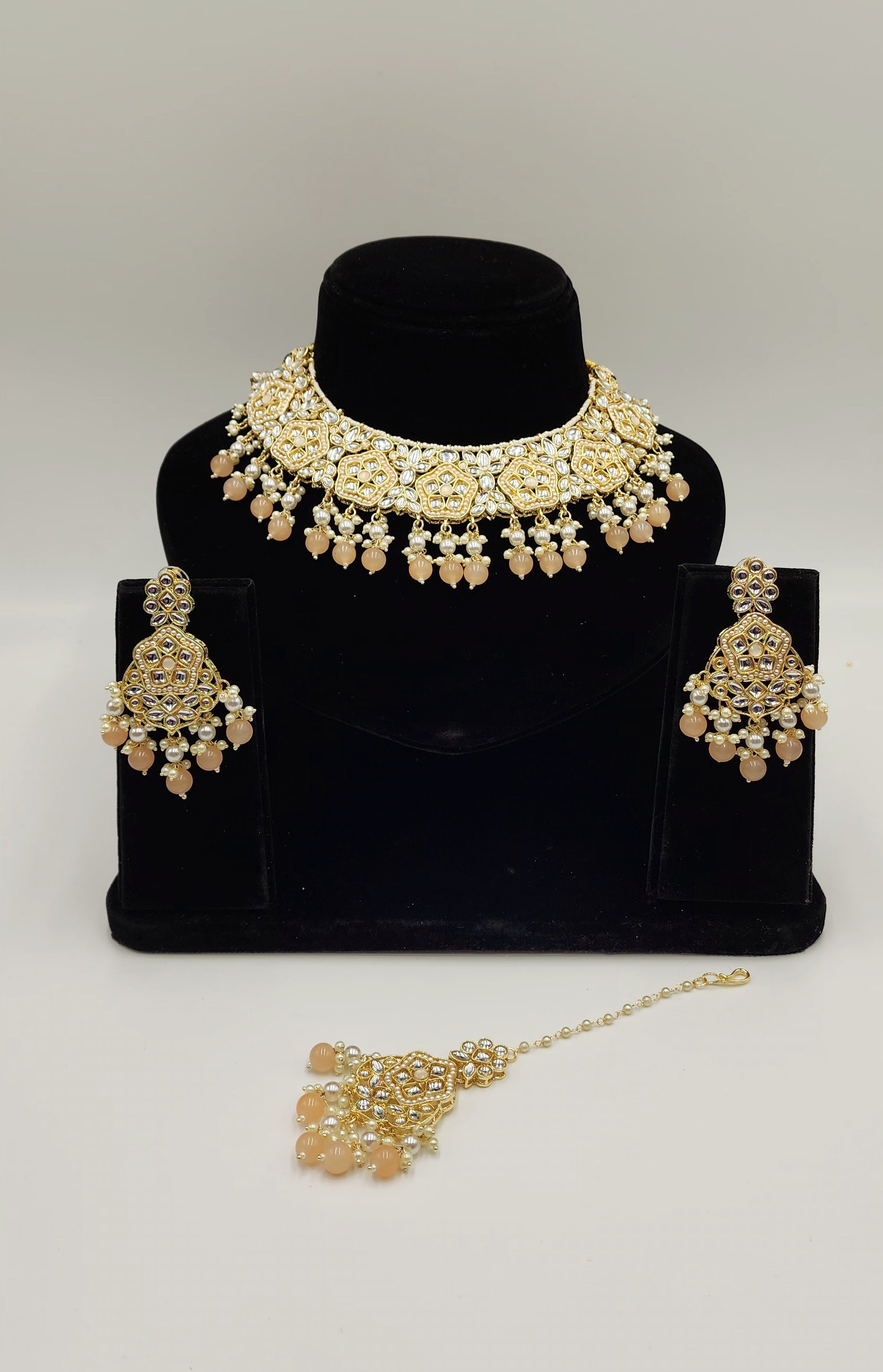 Gold Tone kundan set with Faux Pearls and beads.